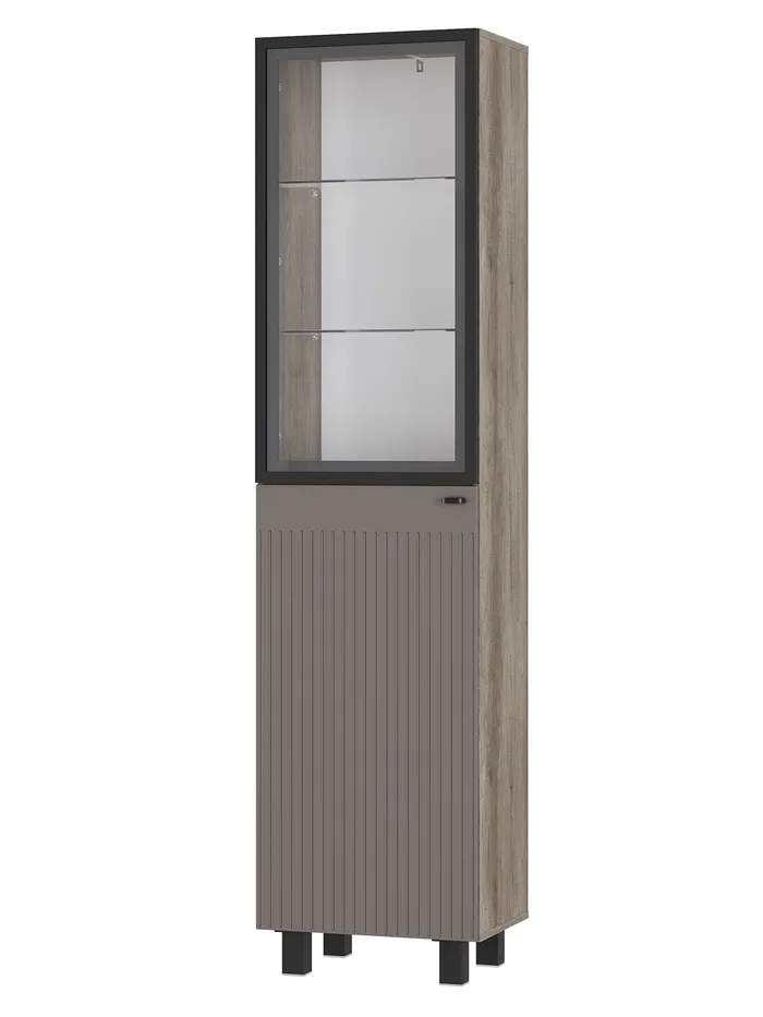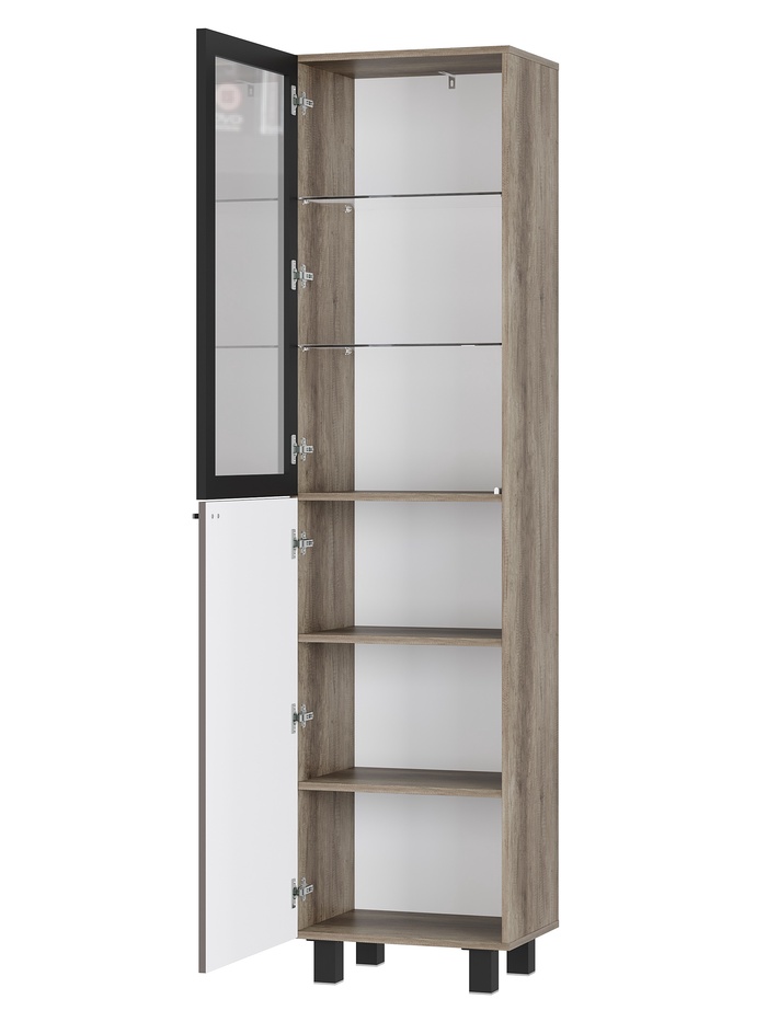 Узкий, но вместительный шкаф – пенал из коллекции «Олива» — практичное и эстетичное решение для хранения в гостиной, столовой или кухне. Современный дизайн с матовыми фасадами и чёрной стеклянной створкой делает модель стильной деталью интерьера, компактная конструкция идеально впишется даже в небольшое пространство.