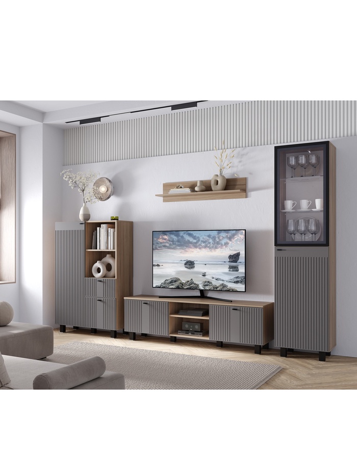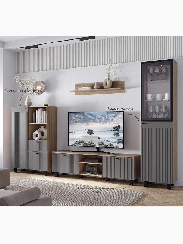 - Полки: закрытые и стеклянные для удобного хранения и эффектной демонстрации предметов