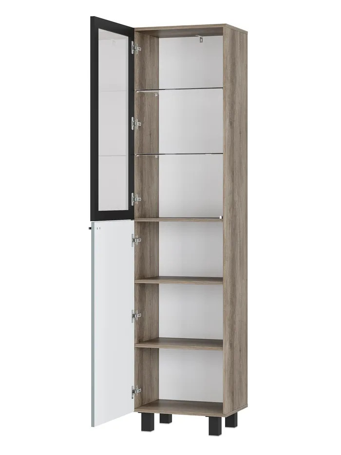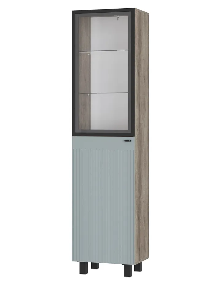 Узкий, но вместительный шкаф – пенал из коллекции «Олива» — практичное и эстетичное решение для хранения в гостиной, столовой или кухне. Современный дизайн с матовыми фасадами и чёрной стеклянной створкой делает модель стильной деталью интерьера, компактная конструкция идеально впишется даже в небольшое пространство.