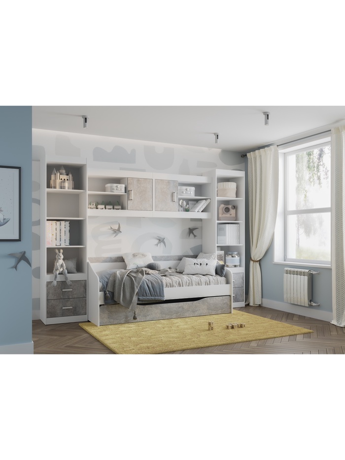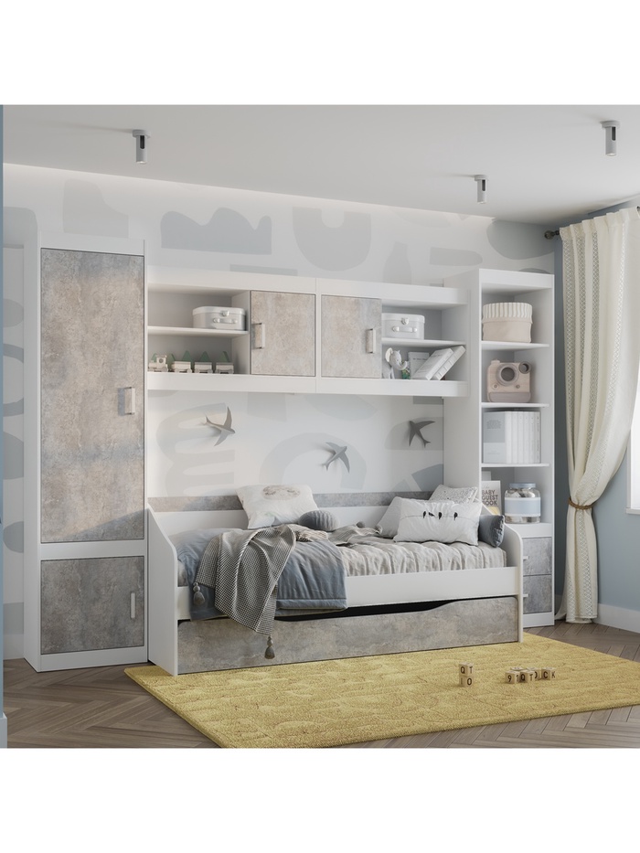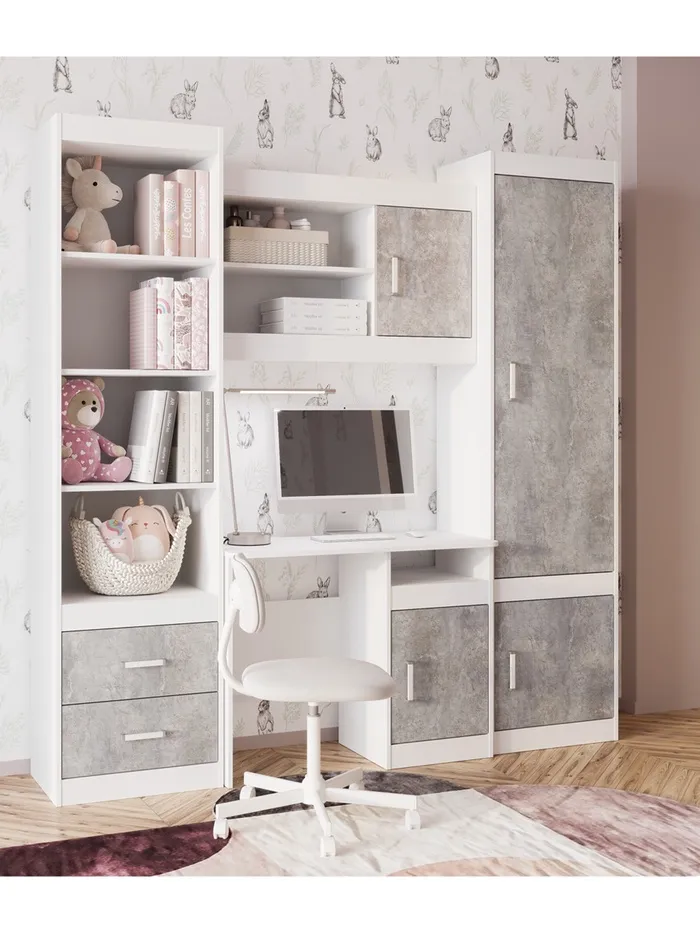 - Материалы и отделка: изготовлен из ЛДСП в светлых оттенках белый и цемент светлый. Все кромки обработаны ПВХ толщиной 0.4 мм для защиты от износа и влаги.