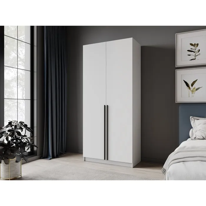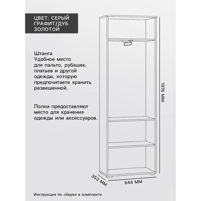 - Внутренняя комплектация: внутри предусмотрено наличие штанг для развешивания одежды и дополнительного ящика для мелких аксессуаров или белья. Полки позволяют оптимально использовать пространство шкафа, размещая вещи на разных уровнях и в разных секциях.