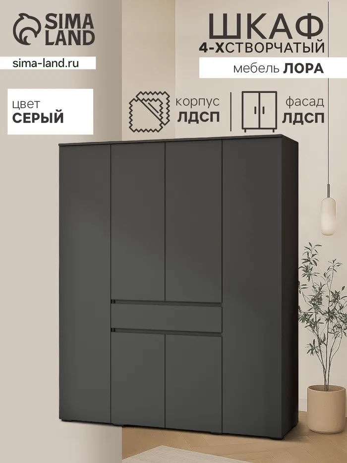 Шкаф прямой четырёхстворчатый для одежды «Лора», 1 ящик, 1800×570×2200 мм, цвет серый — Характеристики