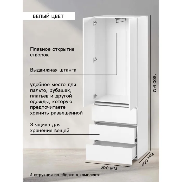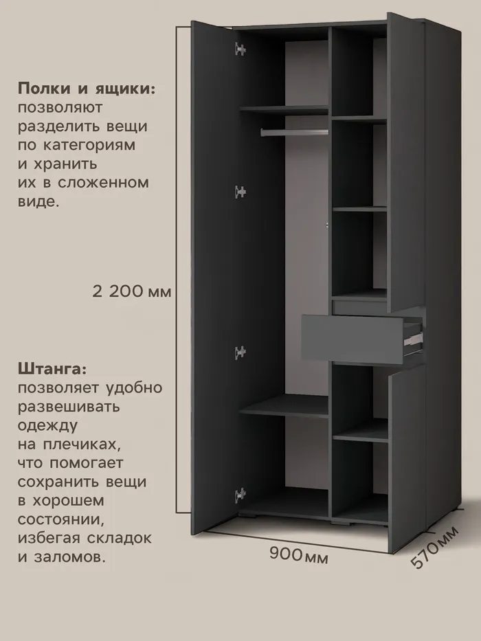 - Внутренняя комплектация: внутри предусмотрено наличие штанги для развешивания одежды и дополнительного ящика для мелких аксессуаров или белья. Полки позволяют оптимально использовать пространство шкафа, размещая вещи на разных уровнях и в разных секциях.