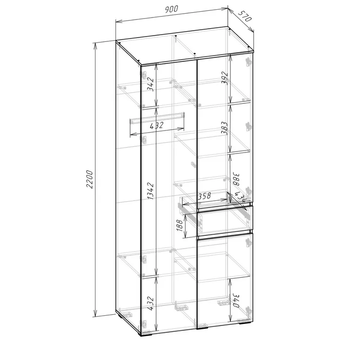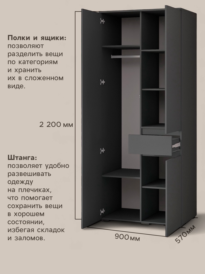 Шкаф прямой двухстворчатый для одежды «Лора», 1 ящик, 900×570×2200 мм, цвет серый — Характеристики