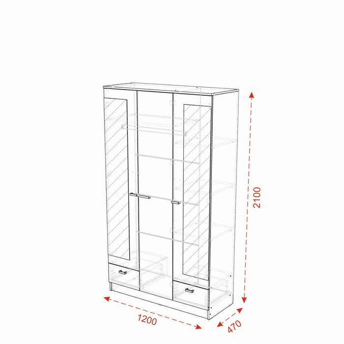 - Имеет размеры 1200х470х2100 мм, что предоставляет обильное место для хранения вашей одежды, белья, обуви и других предметов.