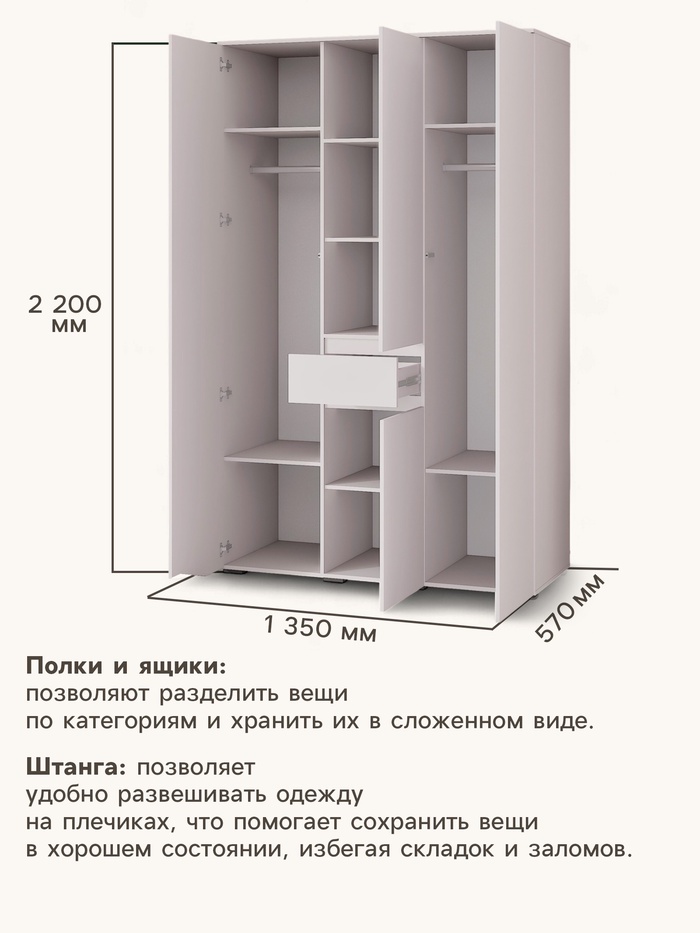 - Внутренняя комплектация: внутри предусмотрено наличие штанг для развешивания одежды и дополнительного ящика для мелких аксессуаров или белья. Полки позволяют оптимально использовать пространство шкафа, размещая вещи на разных уровнях и в разных секциях.