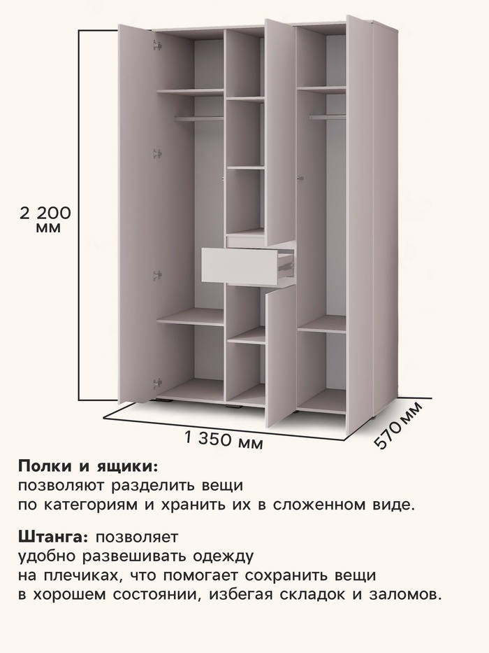 Шкаф прямой трёхстворчатый для одежды «Лора», 1 ящик, 1350×570×2200 мм, цвет кашемир — Характеристики