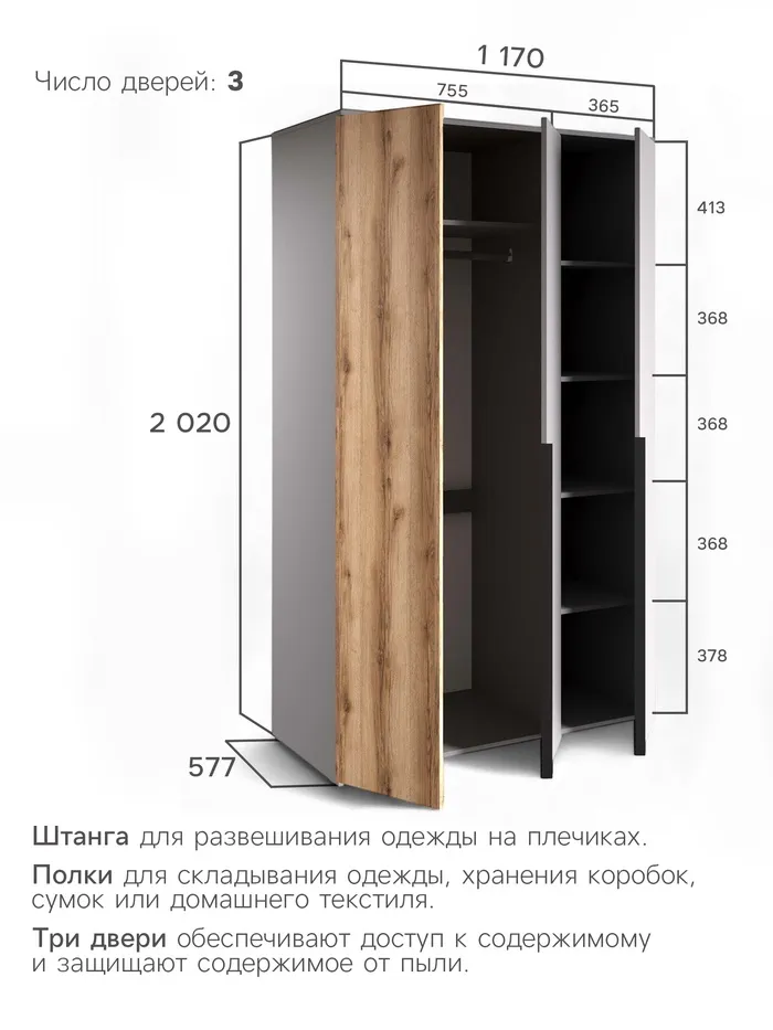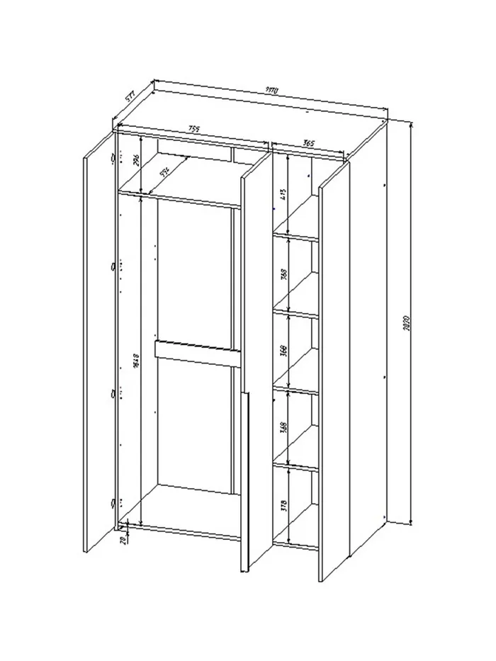 - Вместительное хранение: габариты и продуманная компоновка (полки + штанга) предоставляют достаточно пространства для одежды, обуви, аксессуаров, постельного белья или сезонных вещей.