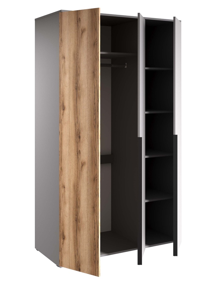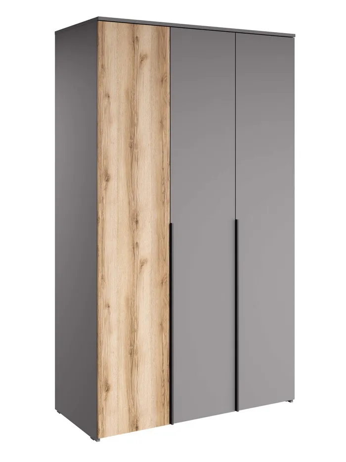 Решение для систематизации гардероба: просторный комбинированный шкаф с тремя дверями. Изготовлен из практичного ЛДСП в элегантном сочетании цветов дуб делано и серый шифер.