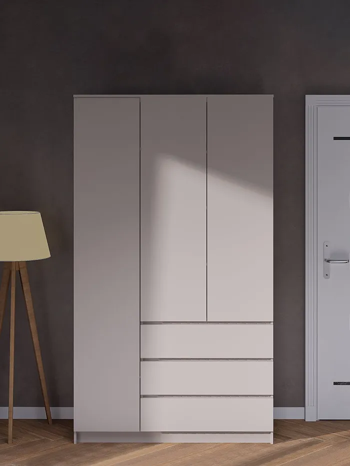 Решение, позволяющее рационально использовать пространство спальни, гостиной или прихожей. Шкаф оснащен удобными полками, штангой и несколькими вместительными ящиками, которые позволят аккуратно разложить ваши личные вещи.