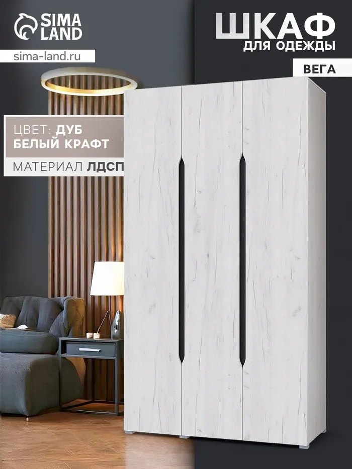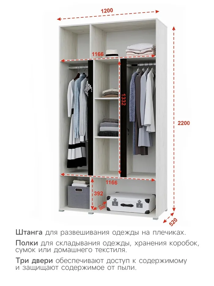 Шкаф трёхстворчатый для одежды «Вега», без зеркала, 1200×2200×520 мм, цвет крафт белый/венге — Характеристики