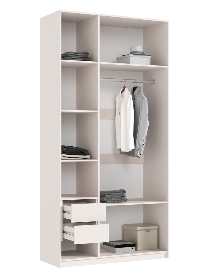 - Функциональное наполнение: полки, штанга для одежды и ящики позволяют хранить одежду, аксессуары и другие предметы.