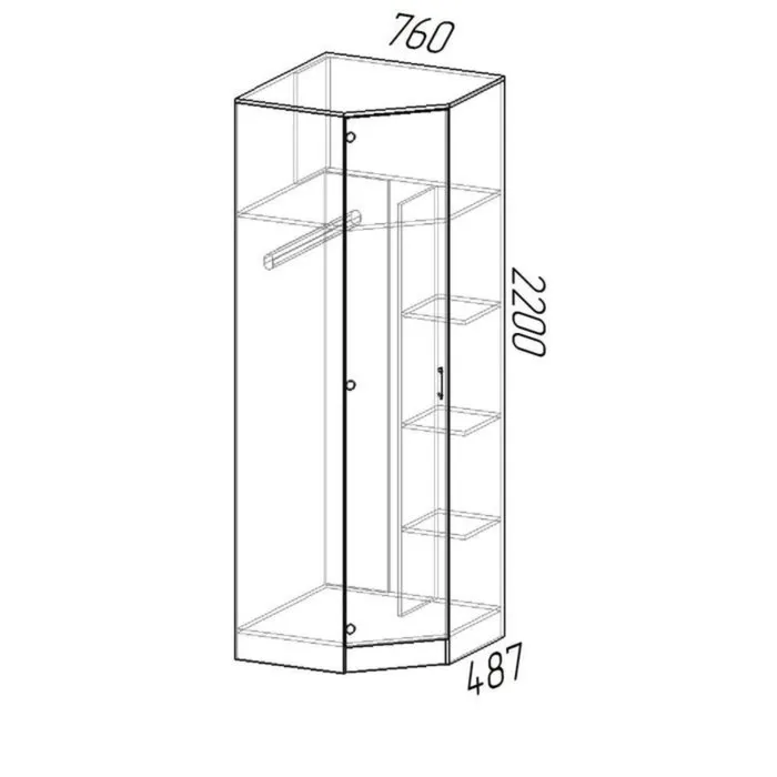 - Этот угловой шкаф имеет компактные размеры 760/760x2200x481 мм, что делает его идеальным для размещения в углу комнаты. Он максимально эффективно использует пространство и предоставляет достаточно места для хранения одежды, белья и других предметов.
