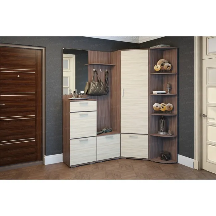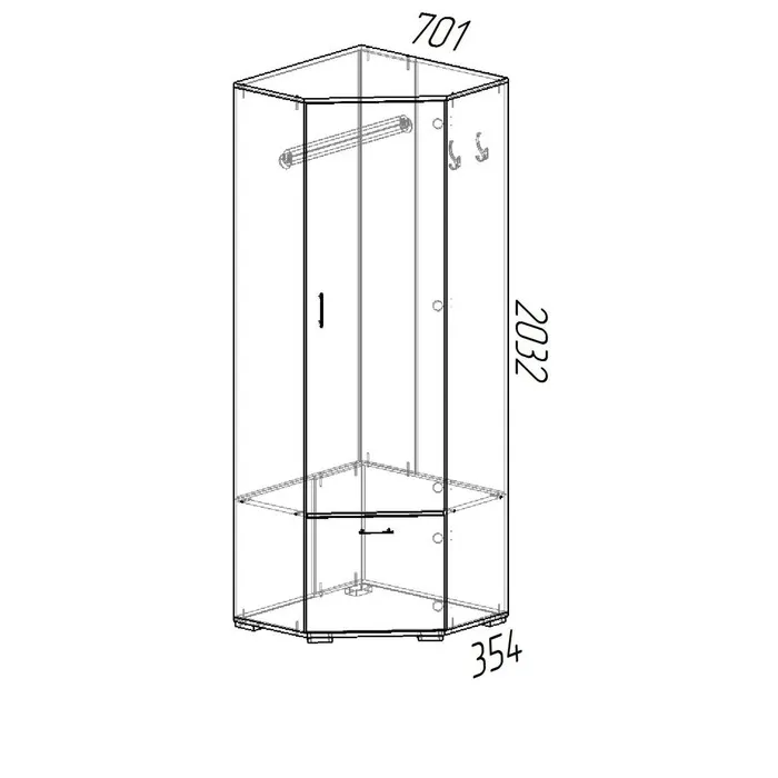 - Этот угловой шкаф имеет компактные размеры 701х701х2032х354 мм, что делает его идеальным для размещения в углу комнаты. Он максимально эффективно использует пространство и предоставляет достаточно места для хранения одежды, белья и других предметов.