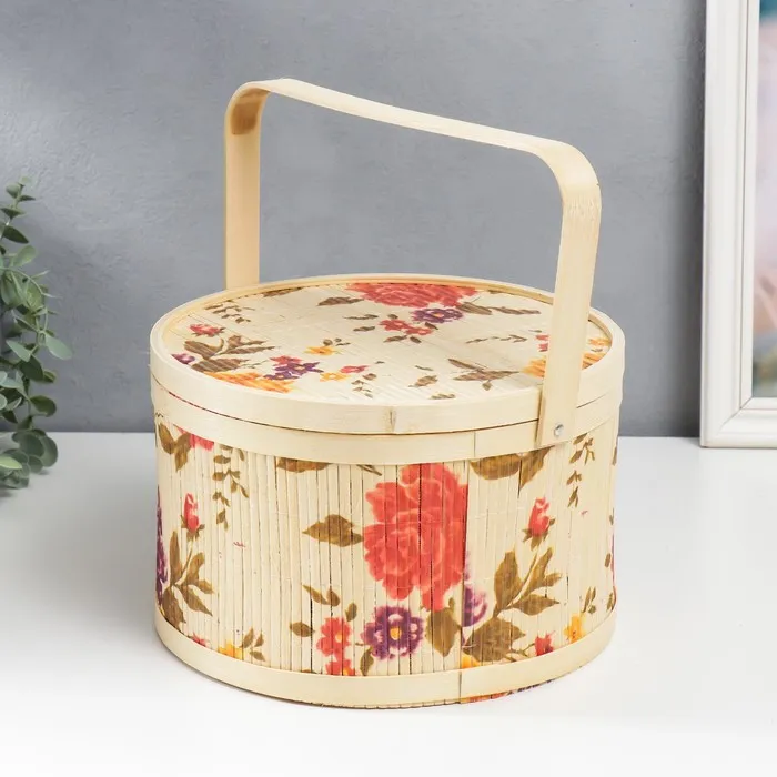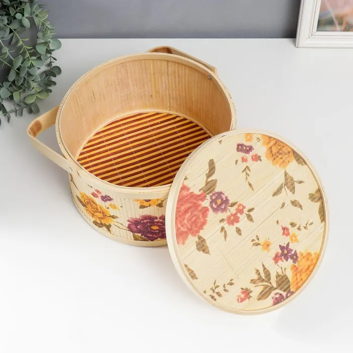 Шкатулка бамбук "Сад с пионами" круглая, с ручками 16х26х26 см — Характеристики