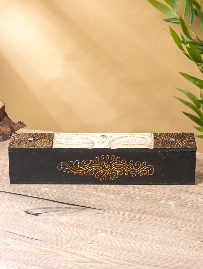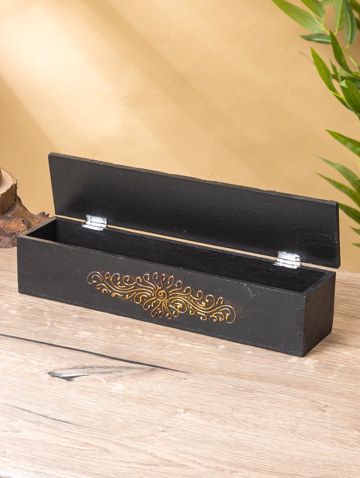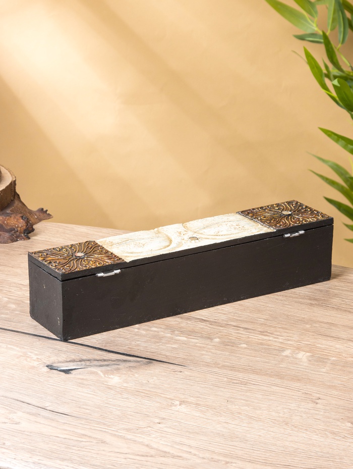 Шкатулка «Будда» — вытянутая чёрная коробка с медитативным узором, созданная для спокойного хранения украшений и мелких сокровищ. Изготовленная из МДФ без покрытия, она сочетает строгую геометрию и восточную символику, оставаясь универсальной для любого интерьера.