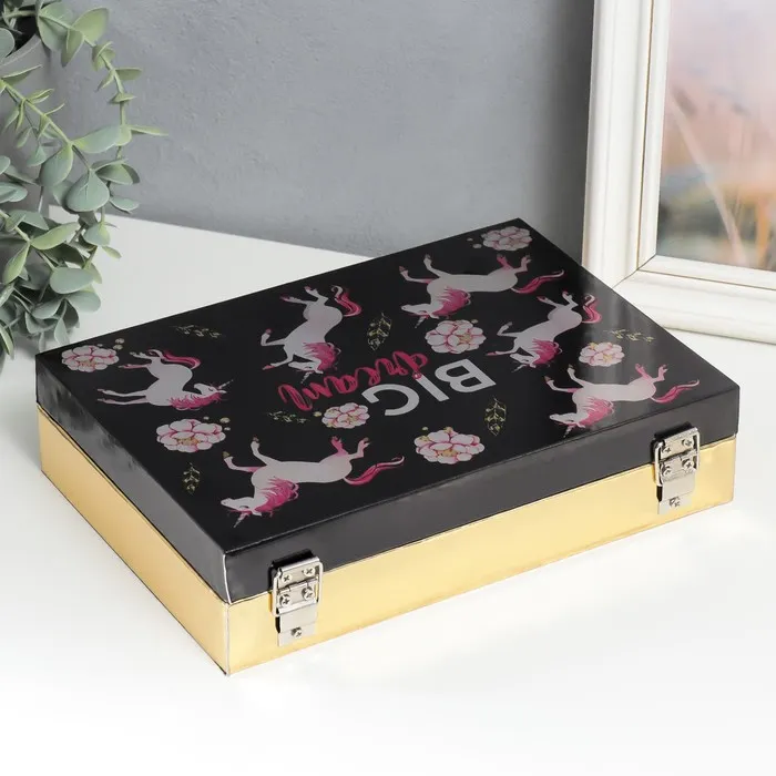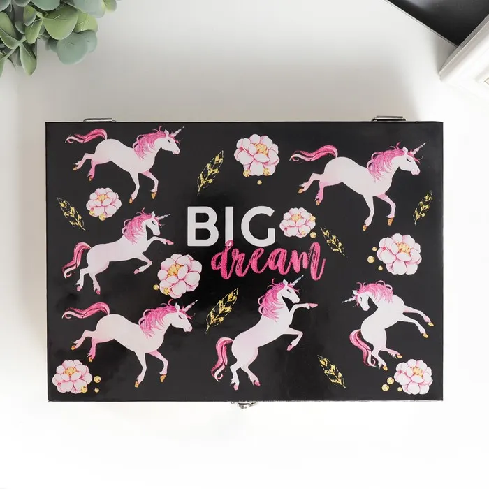 Шкатулка дерево "Розовые единороги на чёрном" кожзам глянец 5,5х24х17 см — Характеристики