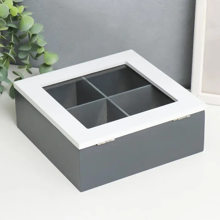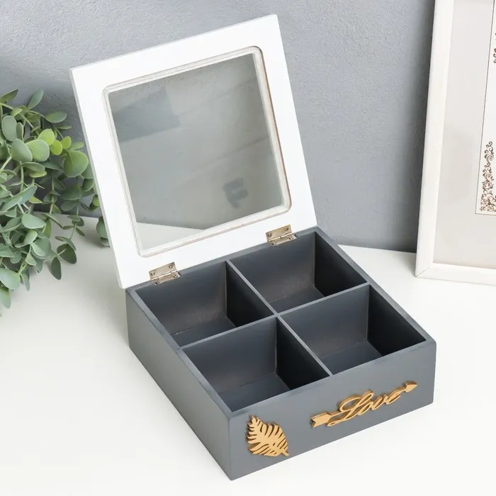 Шкатулка для чая «Лист папоротника», с делениями, дерево, стекло, бело-серая, 18×18×7 см — Характеристики