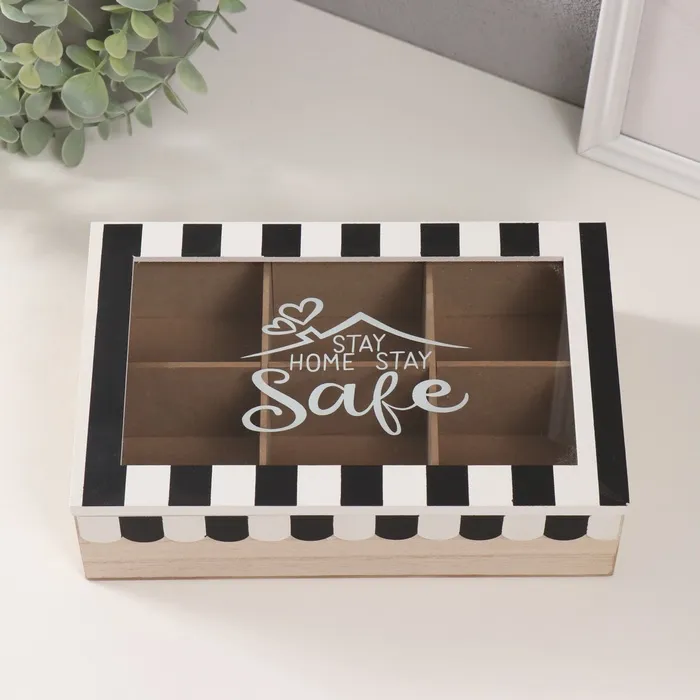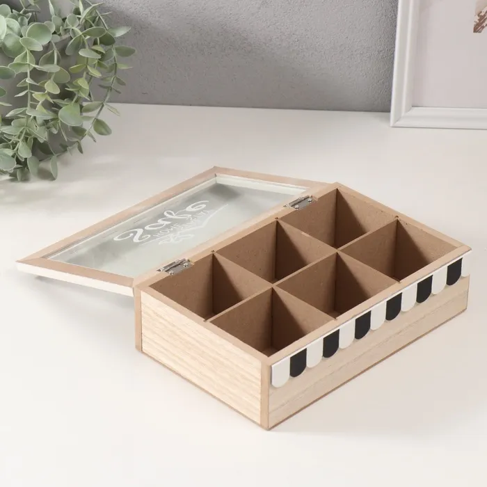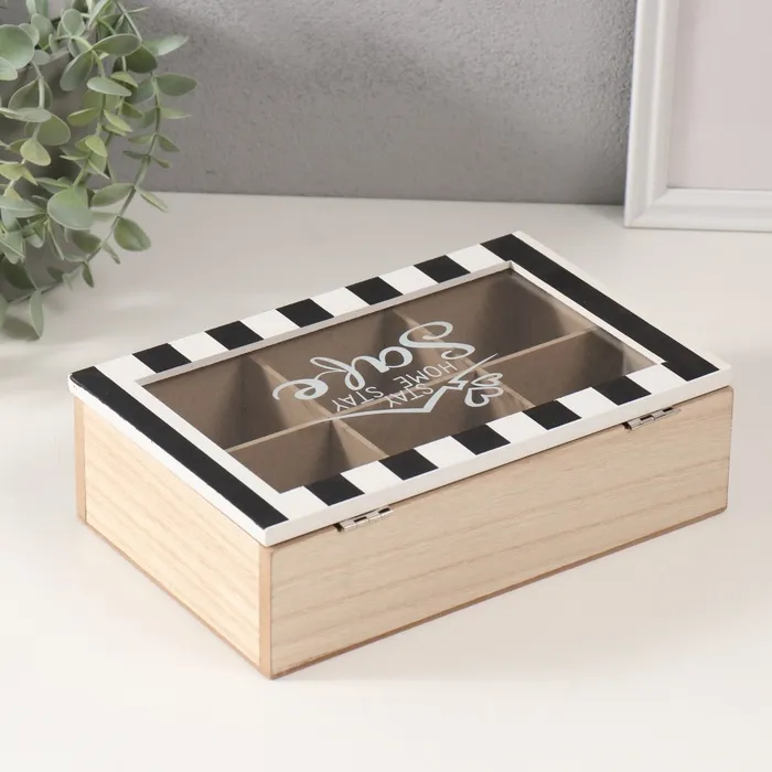 Шкатулка для чая с делениями «Крыша дома с сердечками», дерево, чёрная с белым, 23×15×7 см — Характеристики