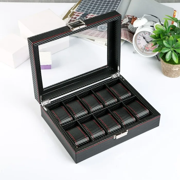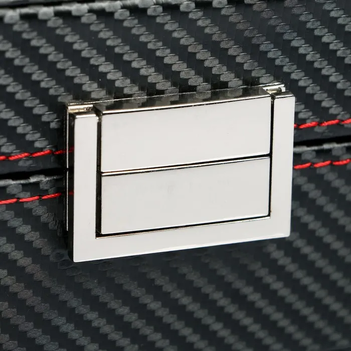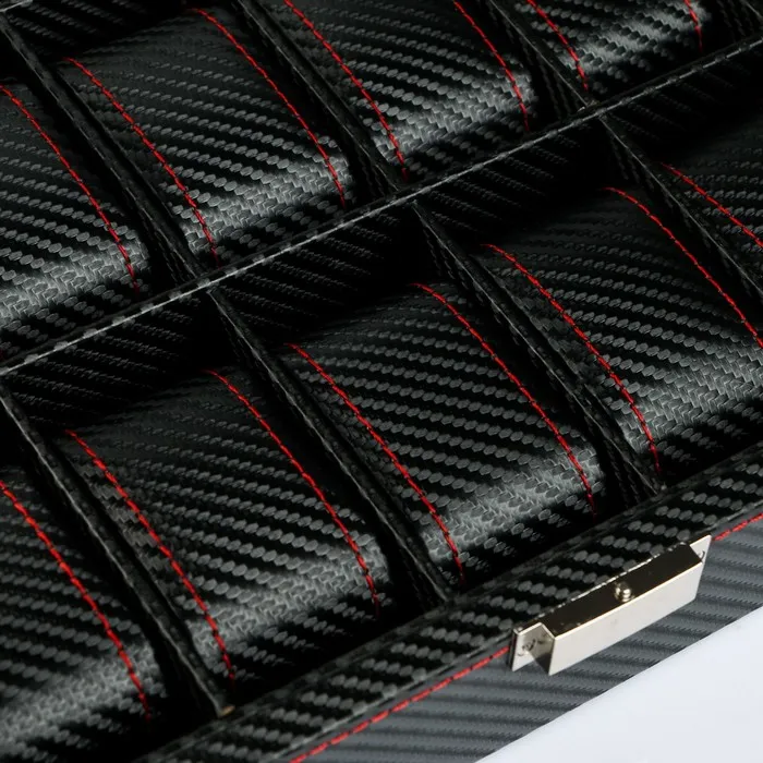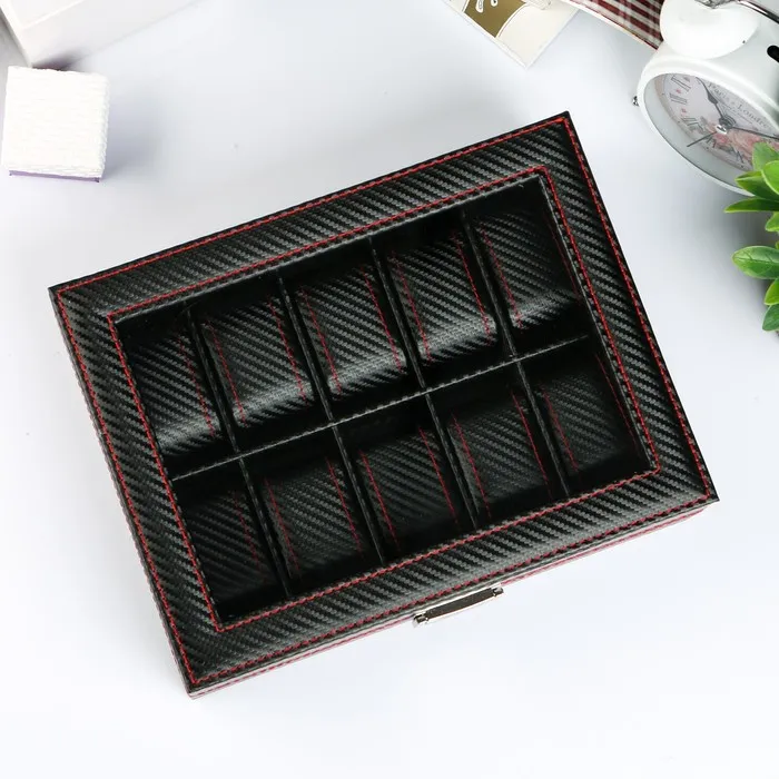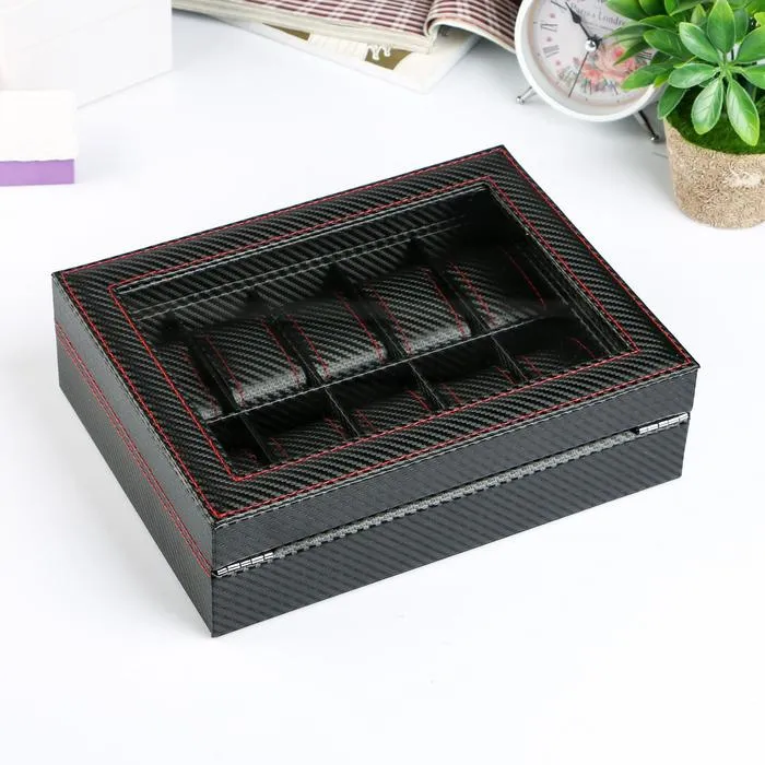 Шкатулка для часов 10 отделений «Карбон с красной строчкой», с замком, искусственная кожа, 8×28×21 см — Характеристики