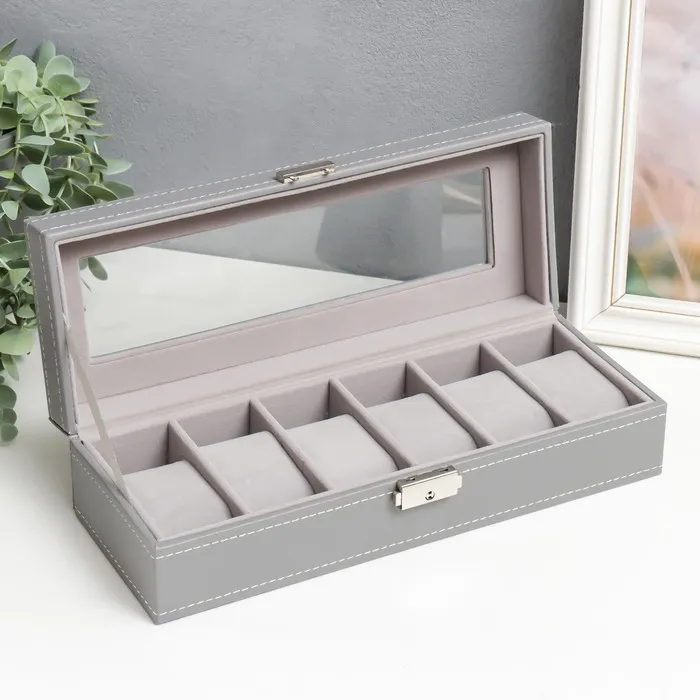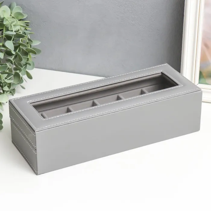 Шкатулка для часов 6 отделений «Серая с белой строчкой», искусственная кожа, 8×30×11 см — Характеристики