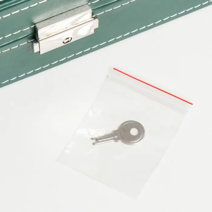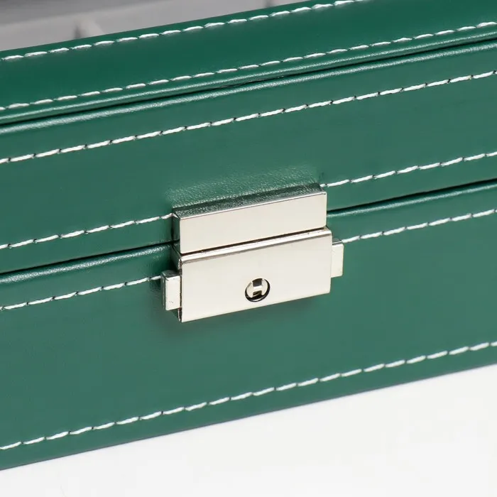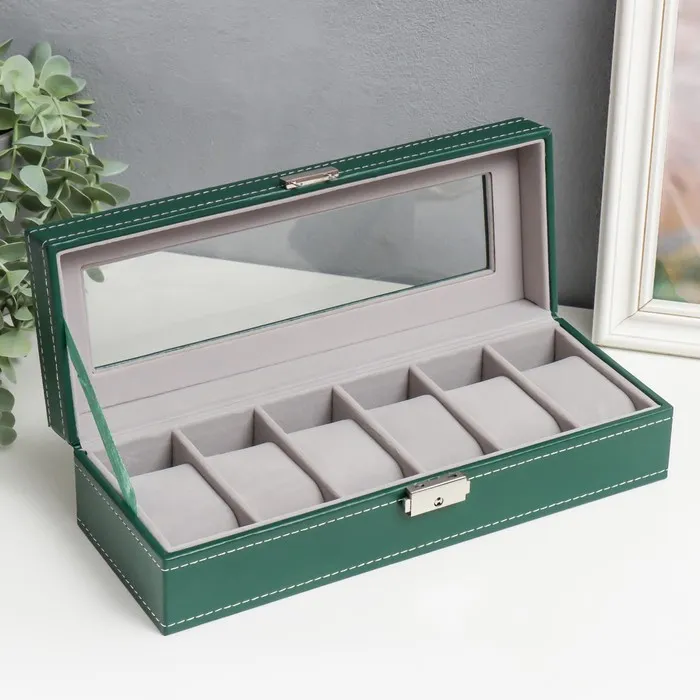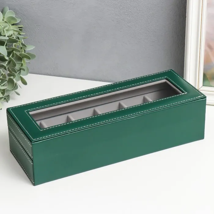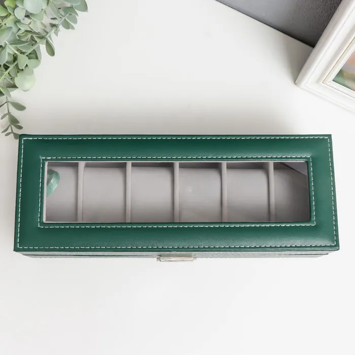 Шкатулка для часов 6 отделений «Зелёная с белой строчкой», с замком, искусственная кожа, 8×30×11 см — Характеристики