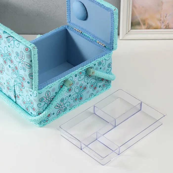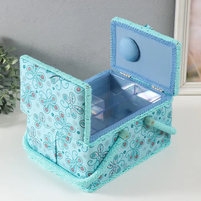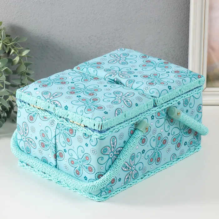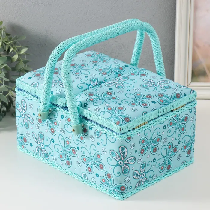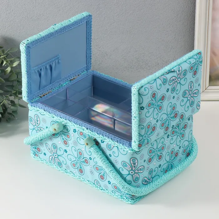 Шкатулка для рукоделия и шитья «Бабочки и цветочки на голубом», хранение ниток, иголок, мелочи, 19х26х14,5 см — Характеристики