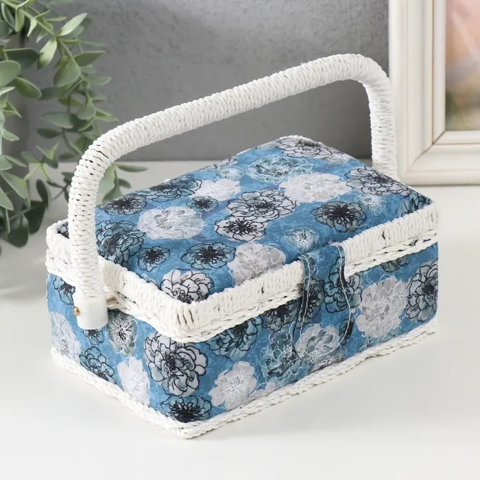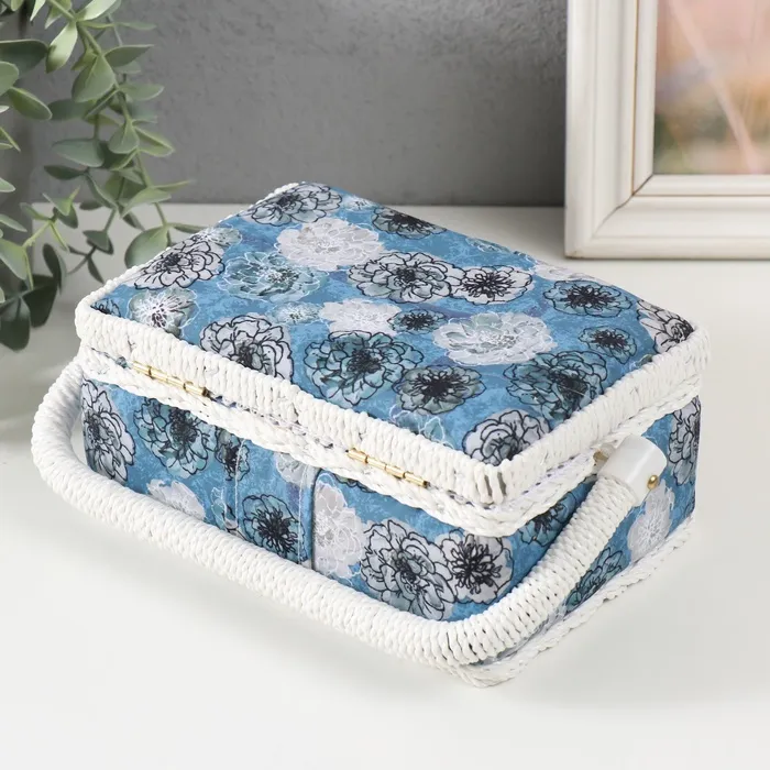 Шкатулка для рукоделия и шитья «Чёрно-белые цветы на голубом», хранение ниток, иголок, мелочи, 18х12х9,5 см — Характеристики