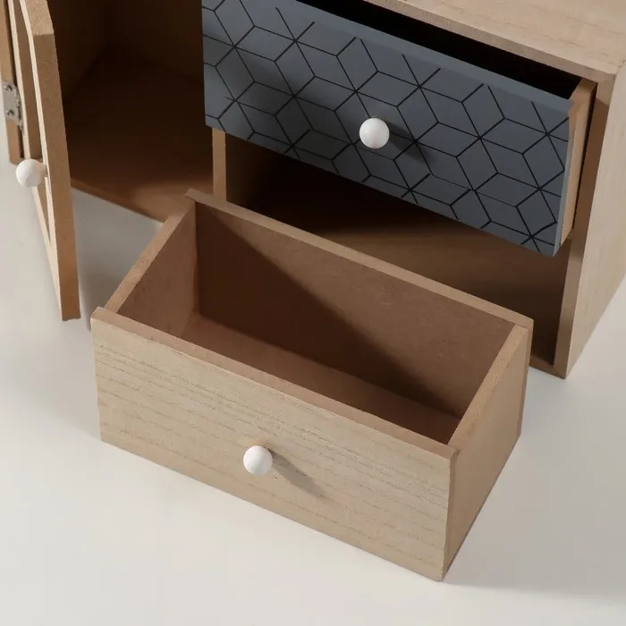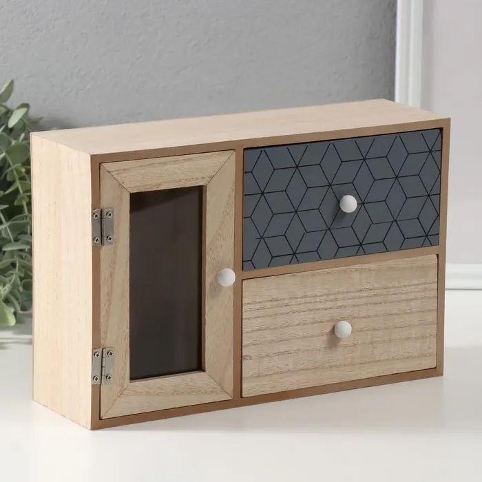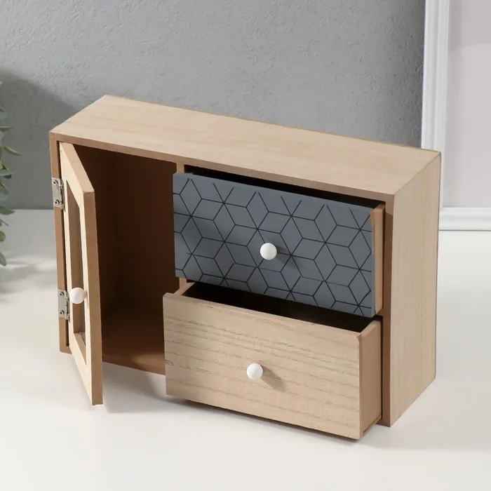 Шкатулка для украшений 2 ящика и дверца «Геометрия», дерево, беж с чёрным, 9.5×28×18.5 см — Характеристики