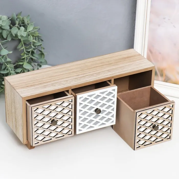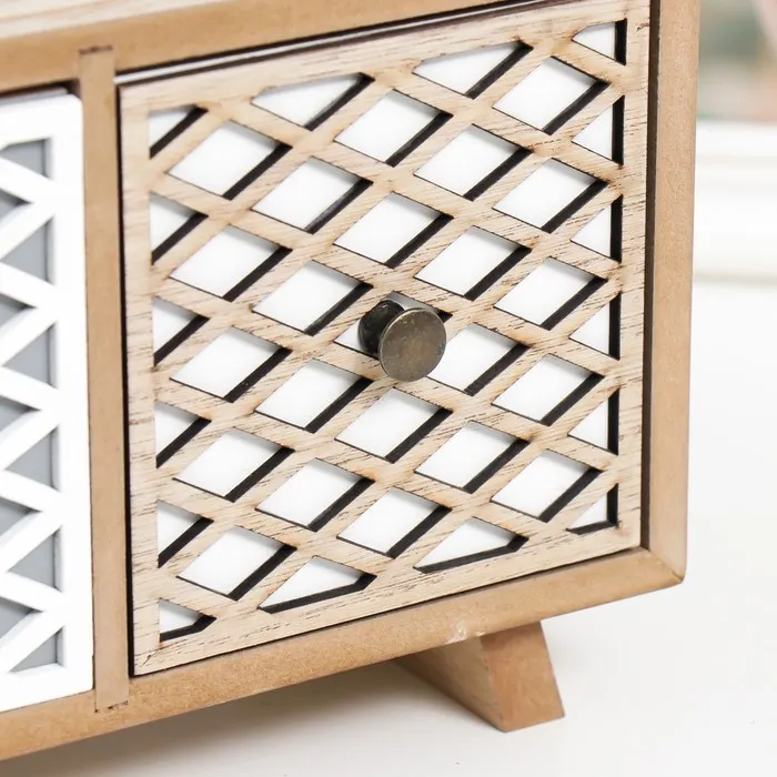 Шкатулка для украшений 3 ящика «Комод. Сетка», дерево, бежево-белая, 10×33×14 см — Характеристики