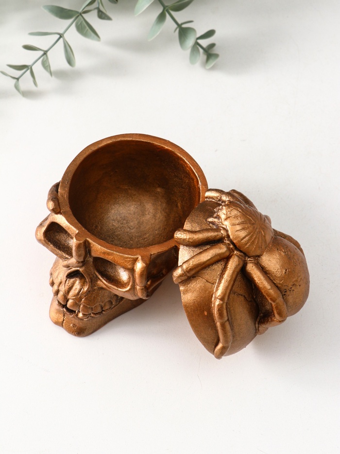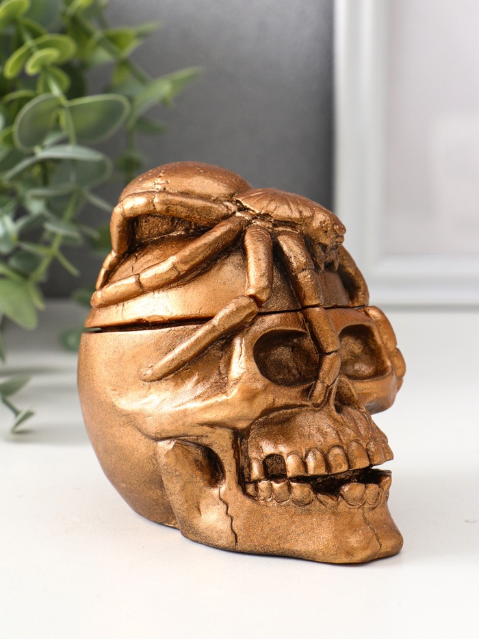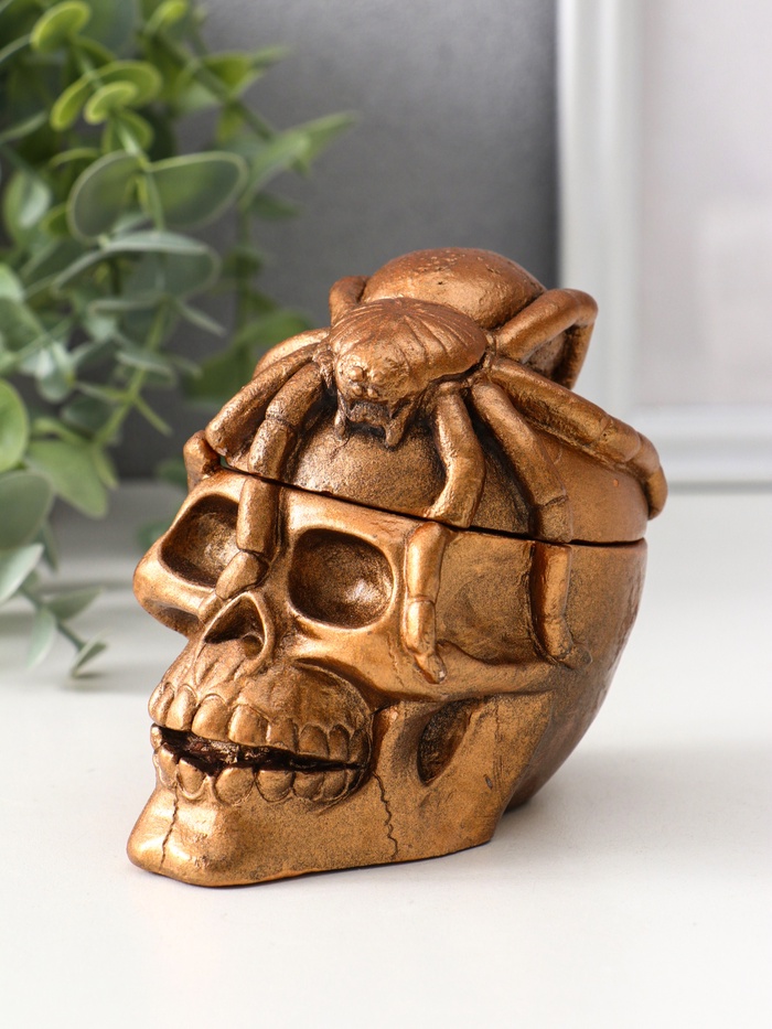 Эта фигурная шкатулка в виде черепа — смелое и стильное решение для хранения украшений и мелких сокровищ. Выполненная из гипса с акриловым покрытием в золотистом оттенке, она привлекает внимание своей выразительной формой и тщательно проработанными деталями. Размеры 10×8×10 см делают её компактной, но вместительной, позволяя удобно разместить в любом уголке вашего интерьера.