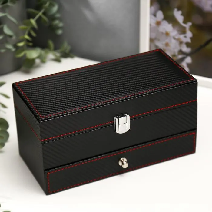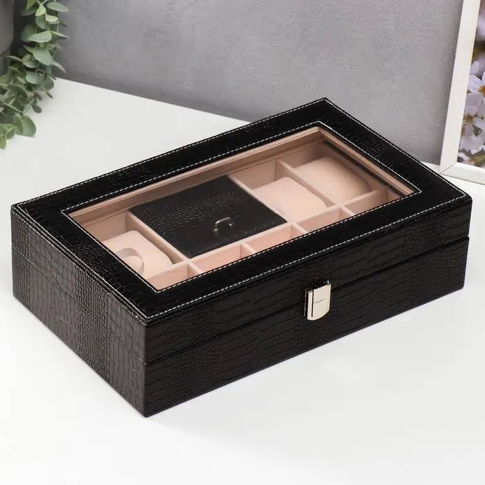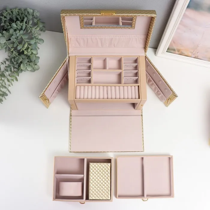 Она снабжена отделениями, которые предназначены для разных украшений: колец, браслетов, часов, колье, цепочек, серег. Изнутри шкатулка покрыта мягким материалом, а снаружи — искусственной кожей, эффектной и качественной.