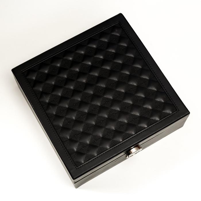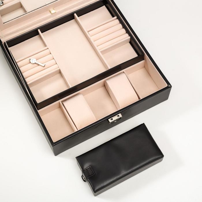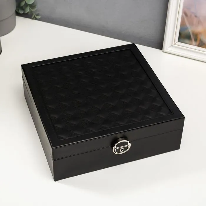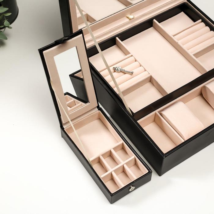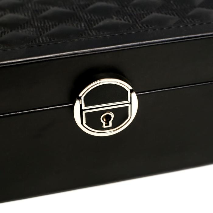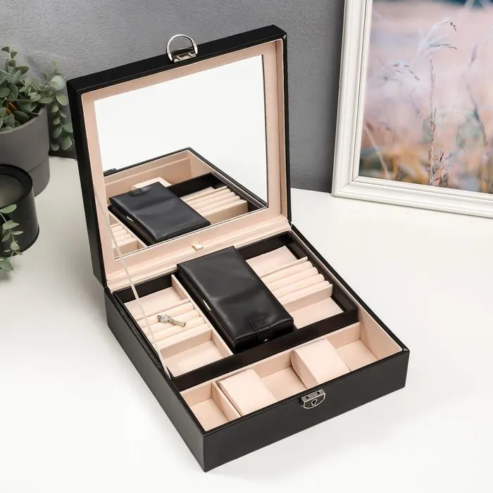 Она снабжена отделениями, которые предназначены для разных украшений: колец, браслетов, часов, колье, цепочек, серег. Изнутри шкатулка покрыта мягким материалом, а снаружи — искусственной кожей, эффектной и качественной.