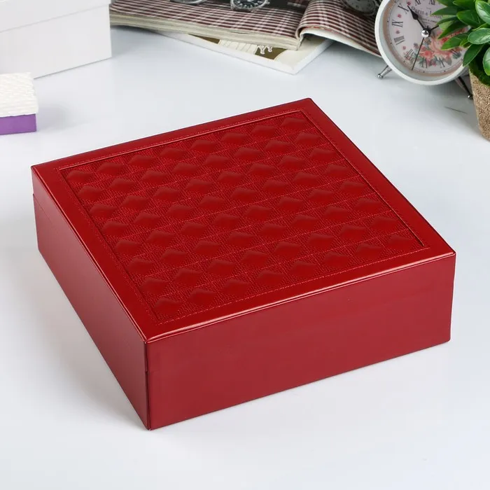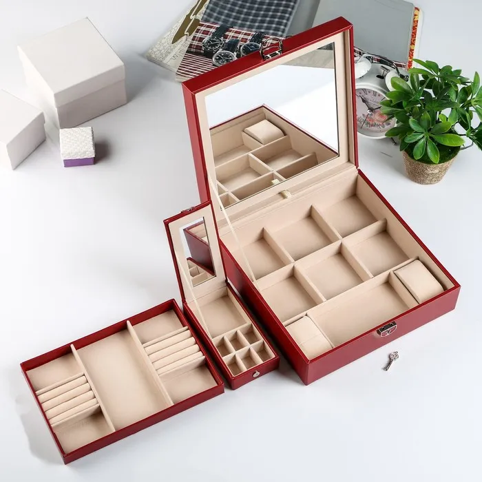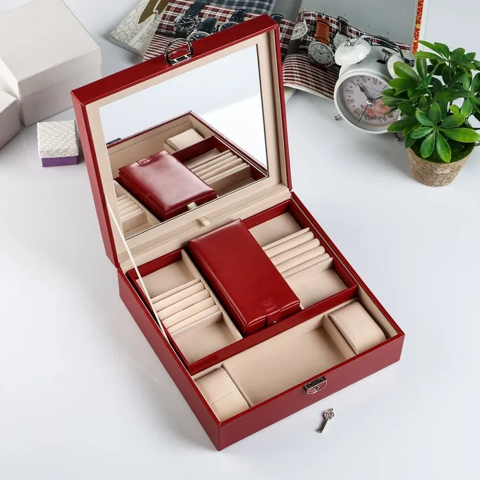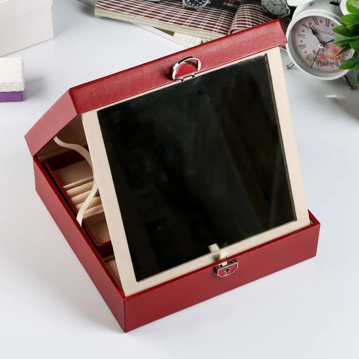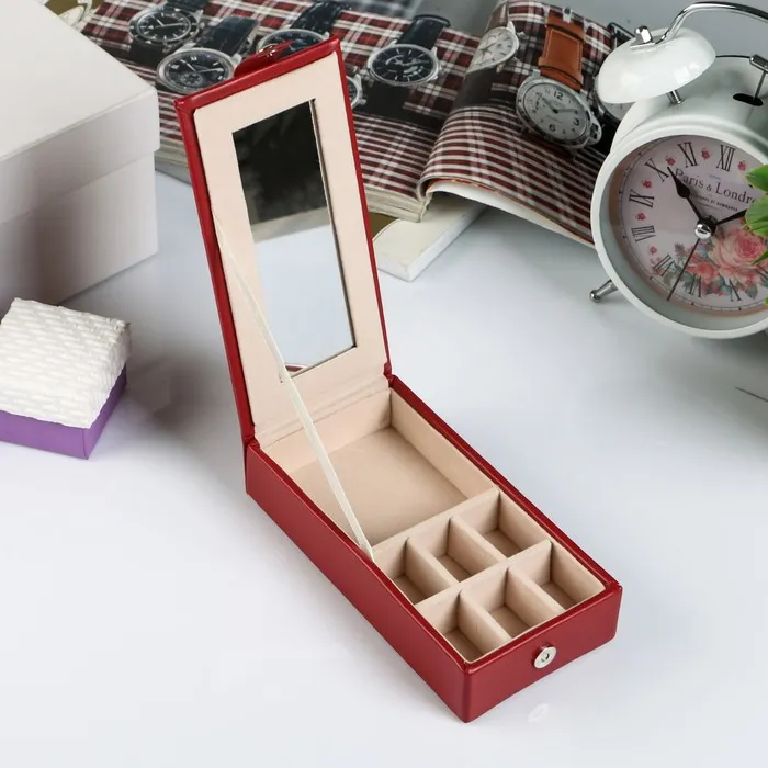 Она снабжена отделениями, которые предназначены для разных украшений: колец, браслетов, часов, колье, цепочек, серег. Изнутри шкатулка покрыта мягким материалом, а снаружи — искусственной кожей, эффектной и качественной.