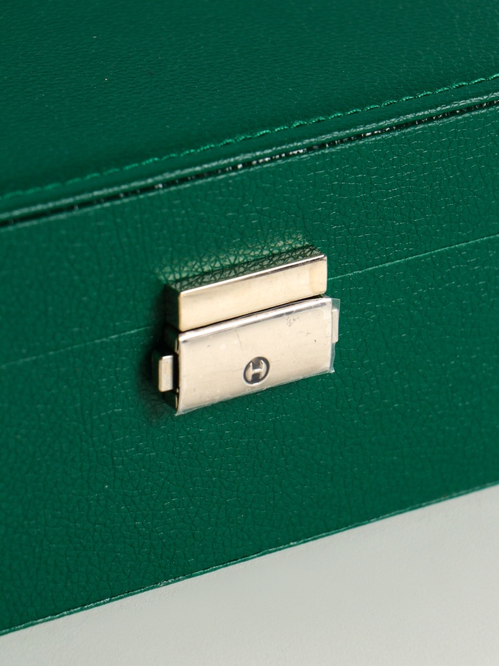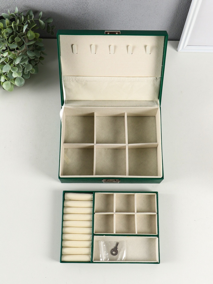 Эта зелёная шкатулка для драгоценностей — надёжный дом для вашей коллекции. В её глубоком отсеке с текстильными отделениями каждая вещь обретает своё место, а съёмная подставка дарит кольцам и серьгам достойное представление. Замок с ключом хранит ваши сокровища и воспоминания, с которыми они связаны.