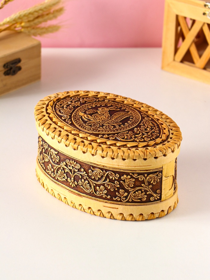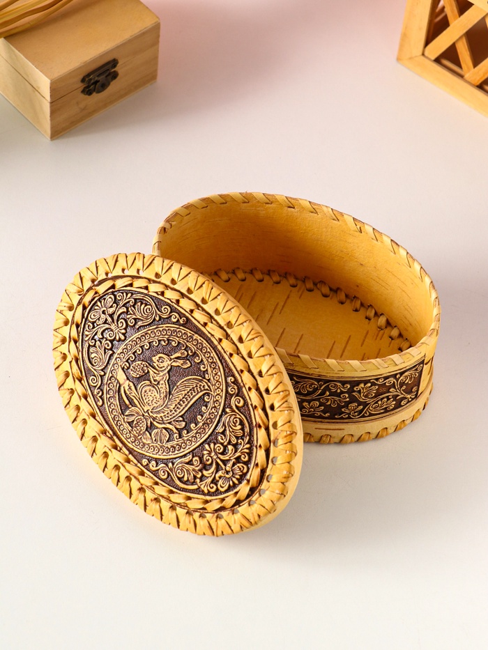 - Натуральная береста: Шкатулка выполнена из коры березы. Этот материал обладает природной прочностью, легкий и приятный на ощупь. Каждое изделие имеет уникальный рисунок и текстуру, подчеркивая его эксклюзивность.