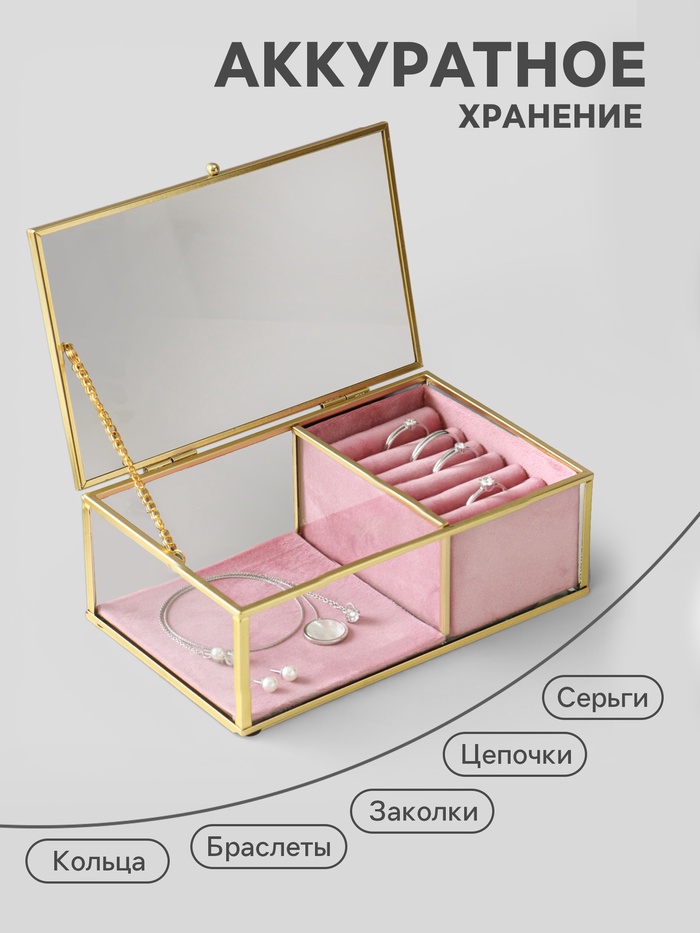 Шкатулка для украшений «Розовая», 2 отделения, стекло с металлическим каркасом, 22×14.5×7.5 — Характеристики