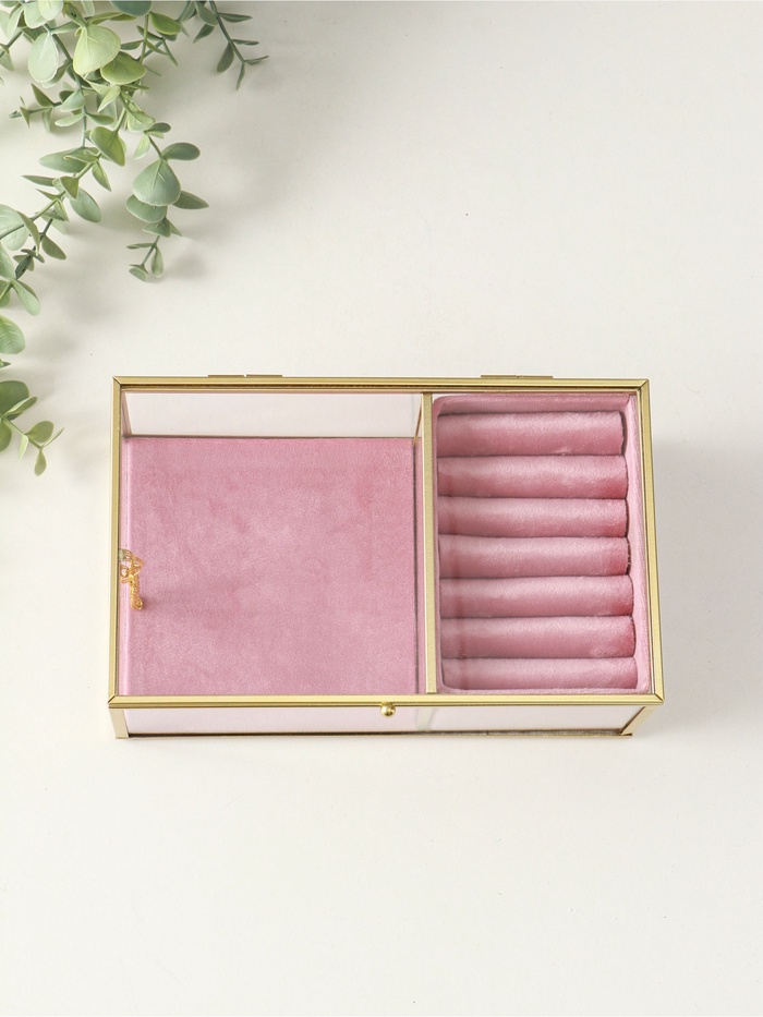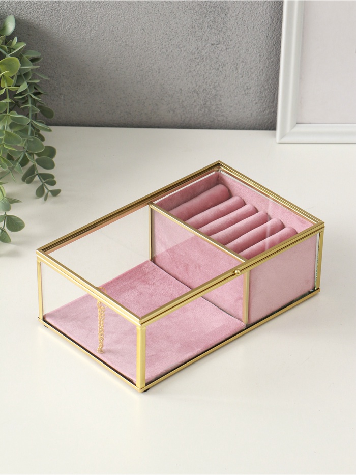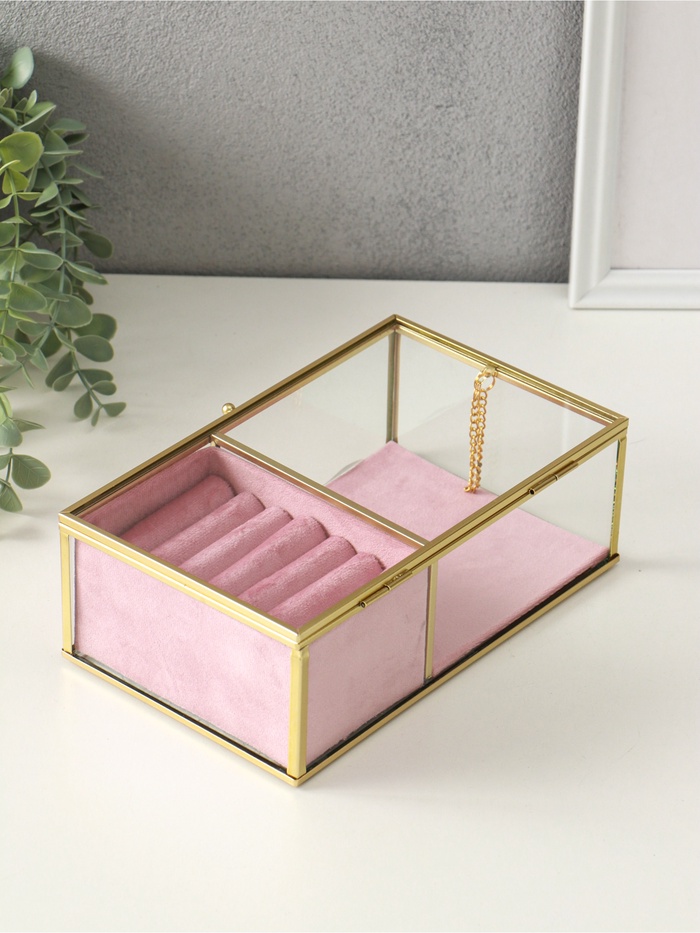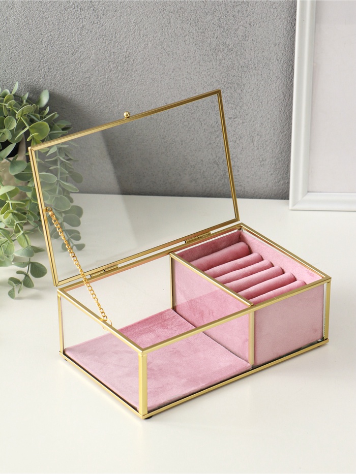 Эта прозрачная шкатулка для украшений — элегантное решение для хранения ваших драгоценностей. Классический дизайн с металлическим каркасом и стеклянными стенками сочетает в себе прочность и лёгкость, создавая ощущение воздушности. Внутри вас ждёт мягкая обивка и два удобных отделения, чтобы кольца, серьги и цепочки всегда оставались в порядке и были защищены от пыли.