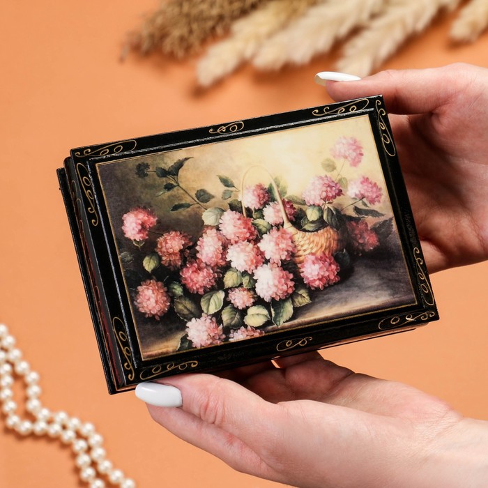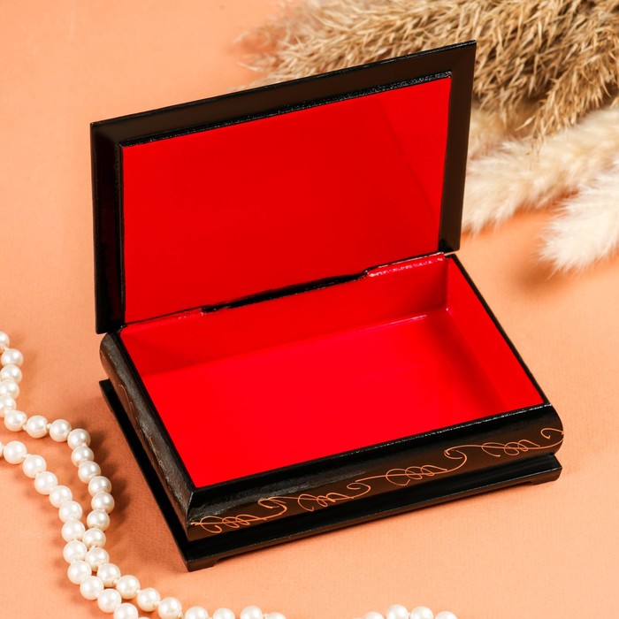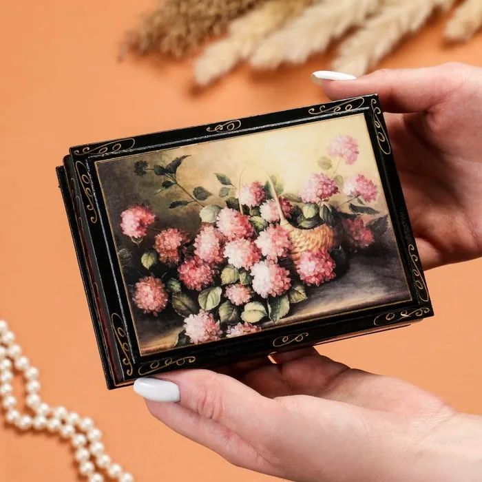 Шкатулка изготовлена из дерева, покрыта краской. Заранее напечатанное изображение приклеено и покрыто лаком. Дополнительно мастер наносит узор.