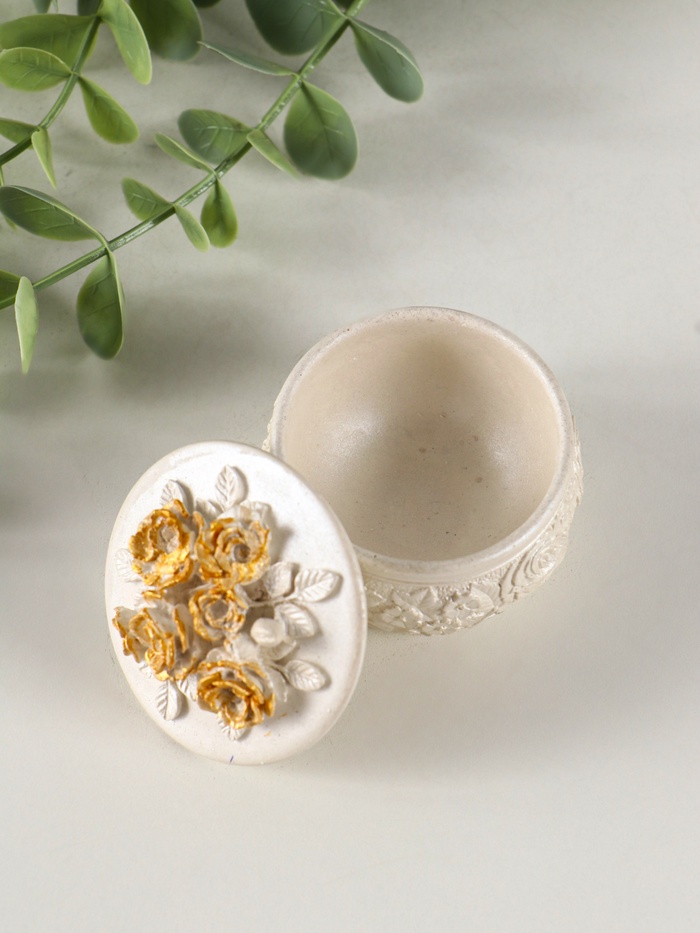 Элегантность в каждой детали! Шкатулка для украшений с розами — это изящный аксессуар из гипса, который станет достойным обрамлением для вашей коллекции. Крышка, украшенная рельефным цветочным орнаментом, добавляет образу шкатулки винтажный шарм и делает её универсальным подарком.