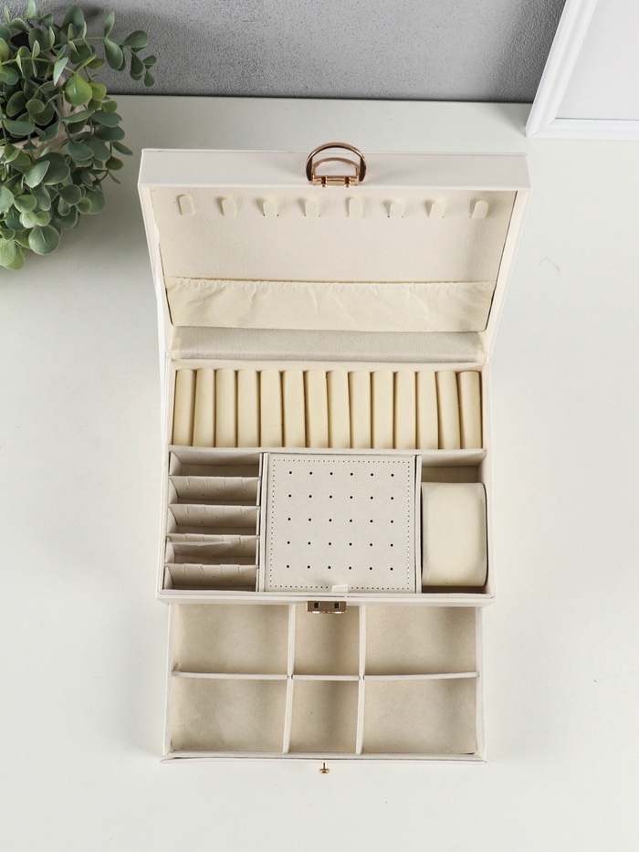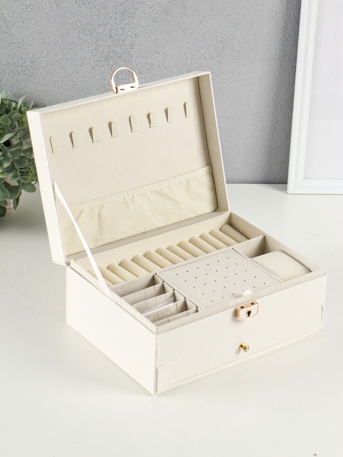 Разделители внутри помогают разложить даже мелкие серьги-пусеты, предотвращая их потерю. Верхний ярус удобен для часто носимых вещей, а нижний — для хранения более ценных или сезонных украшений. Шкатулка станет практичным решением, которое сбережёт ваши драгоценности от пыли и спутывания.