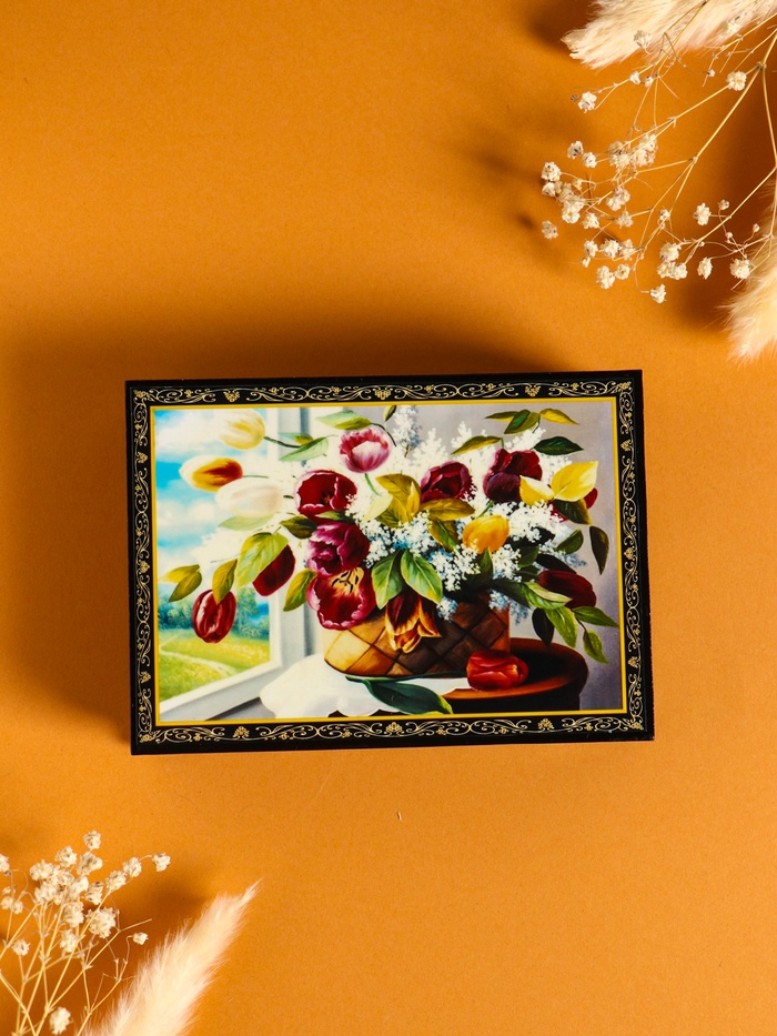- Натюрморт «Цветы в корзине»: Крышка шкатулки украшена изображением пышного букета в плетёной корзине. Миниатюра выполнена в насыщенных тонах, которые подчеркивают естественную красоту цветов. Такой сюжет создаёт настроение уюта и гармонии.