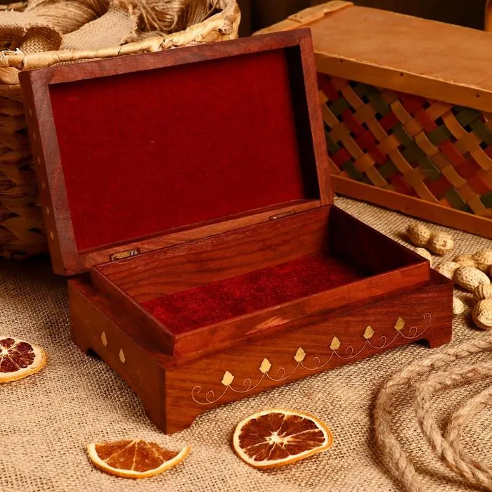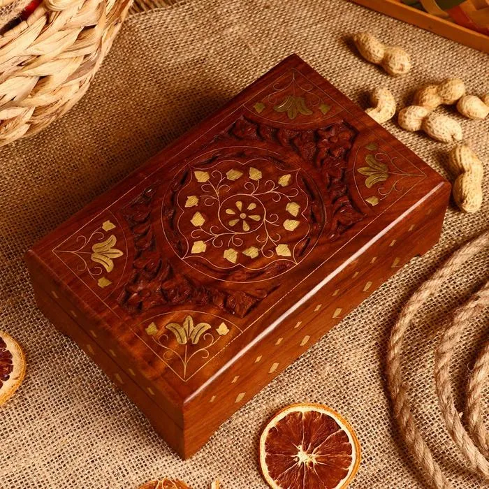 Эта шкатулка привлекает внимание своей лаконичной прямоугольной формой и натуральным коричневым оттенком, который подчеркивает текстуру дерева. Её универсальный дизайн с цветочно-растительной тематикой позволяет гармонично вписаться в любой интерьер, будь то классический стиль, прованс или современный минимализм. Латунные элементы добавляют изделию изысканности и долговечности, делая его не только красивым, но и надёжным.