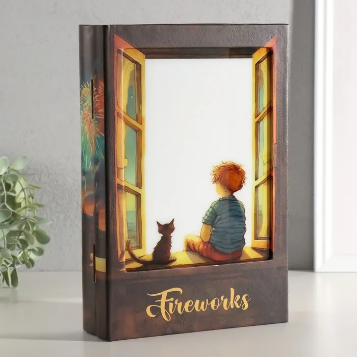 Шкатулка книга-сейф световая «Малыш и кот наблюдают за салютом», с замком и ключами, 28×19×6 см — Характеристики