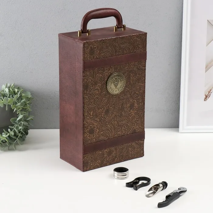 Шкатулка подарочная для 2 бутылок «Пышные листья», дерево, искусственная кожа, 4 предмета, 36×12×20 см