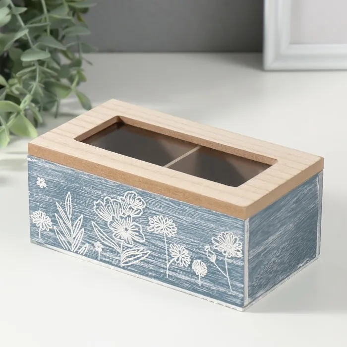 Шкатулка для чая 2 деления «Полевые растения», дерево, синяя, 8.8×16.2×7 см
