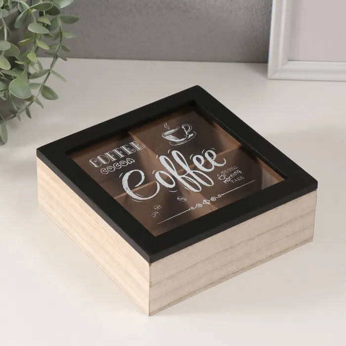 Шкатулка для чая 4 деления «Утро начинается с кофе», дерево, 18.2×18.2×7.2 см