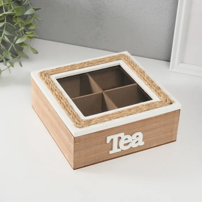 Шкатулка для чая с делениями «С рамкой из джута», дерево, 23.5×23.5×7 см