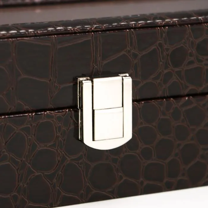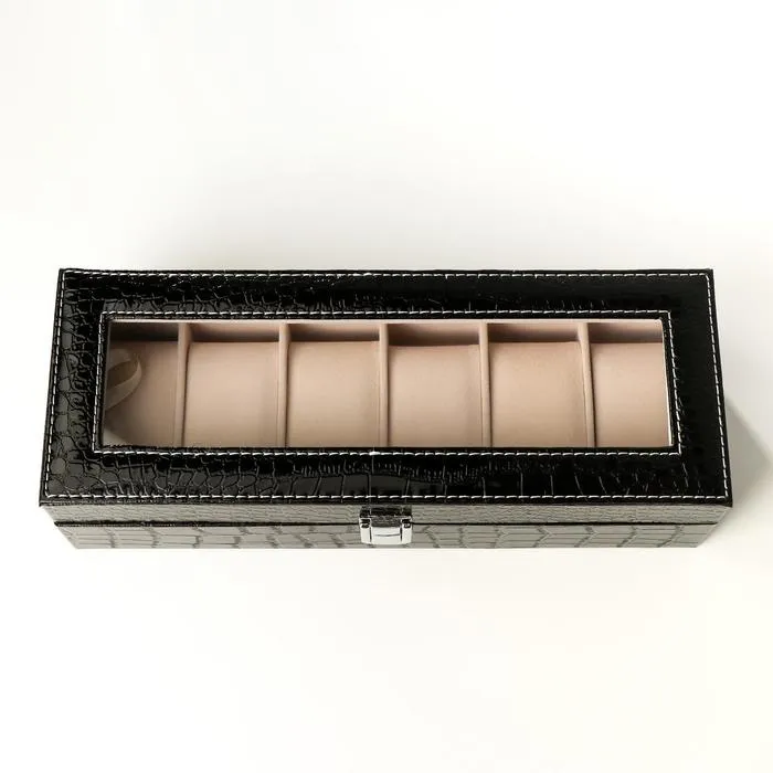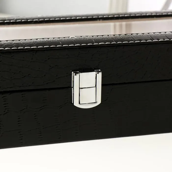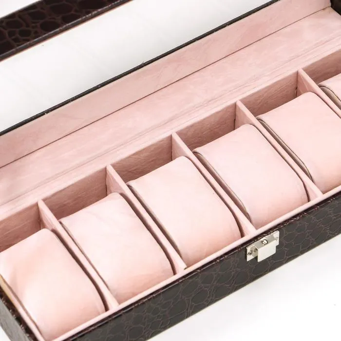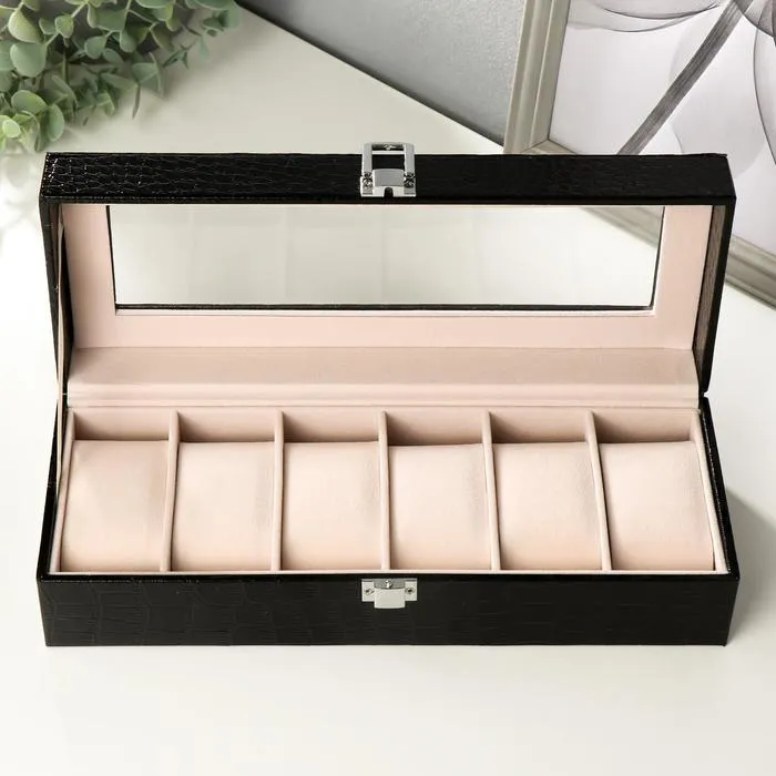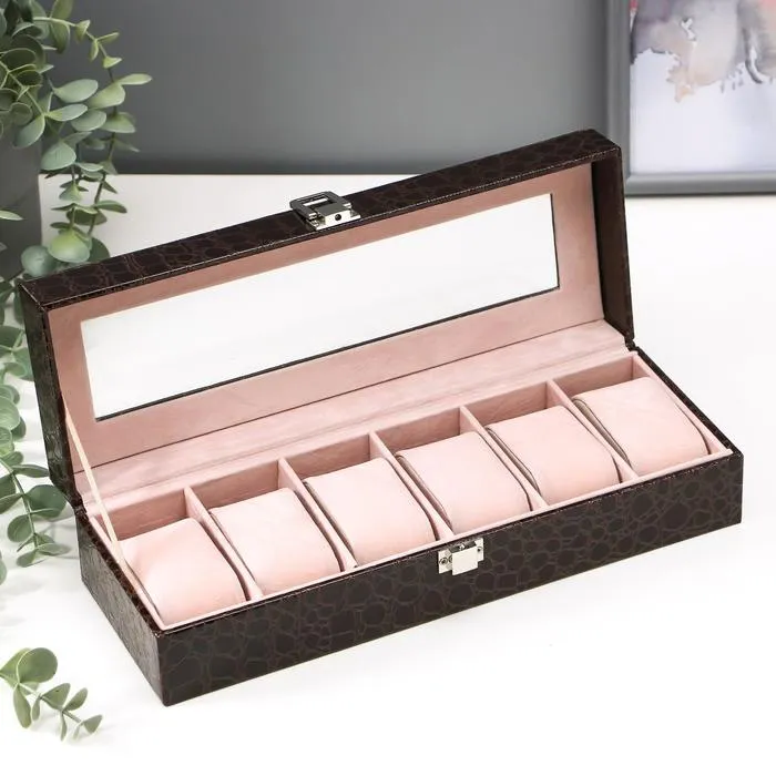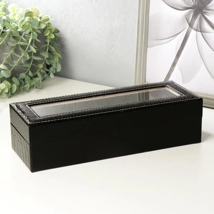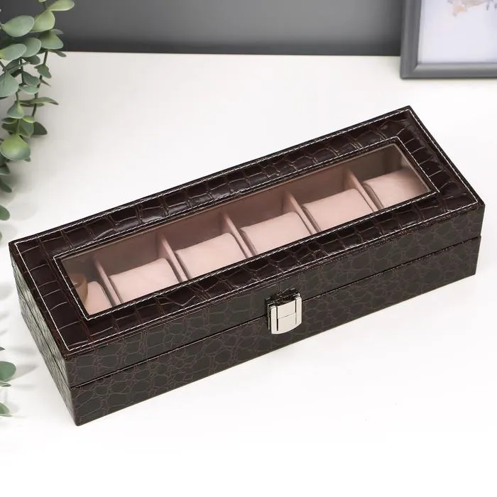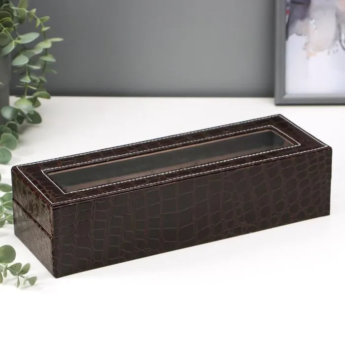 Такая шкатулка – не просто стильный элемент гардеробной или туалетного столика, но и весьма полезный аксессуар: ее внутреннее пространство разделено на отделения, каждое из которых предназначено для наручных часов. Изящная и аккуратная, шкатулка изготовлена из дерева, изнутри покрыта мягким и бархатистым материалом, а снаружи – эффектной искусственной кожей.