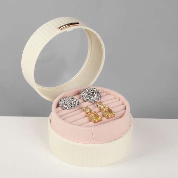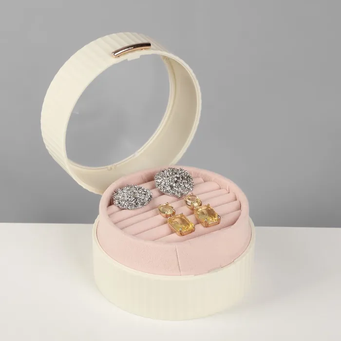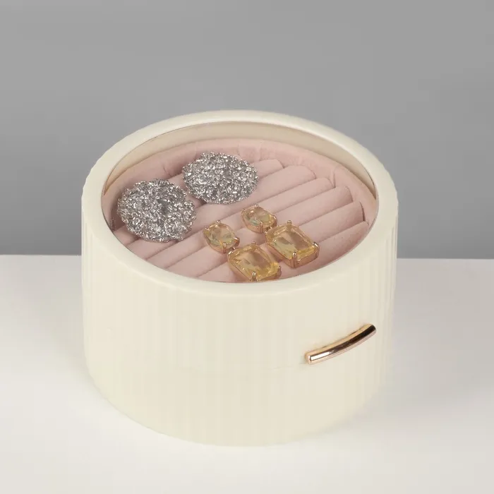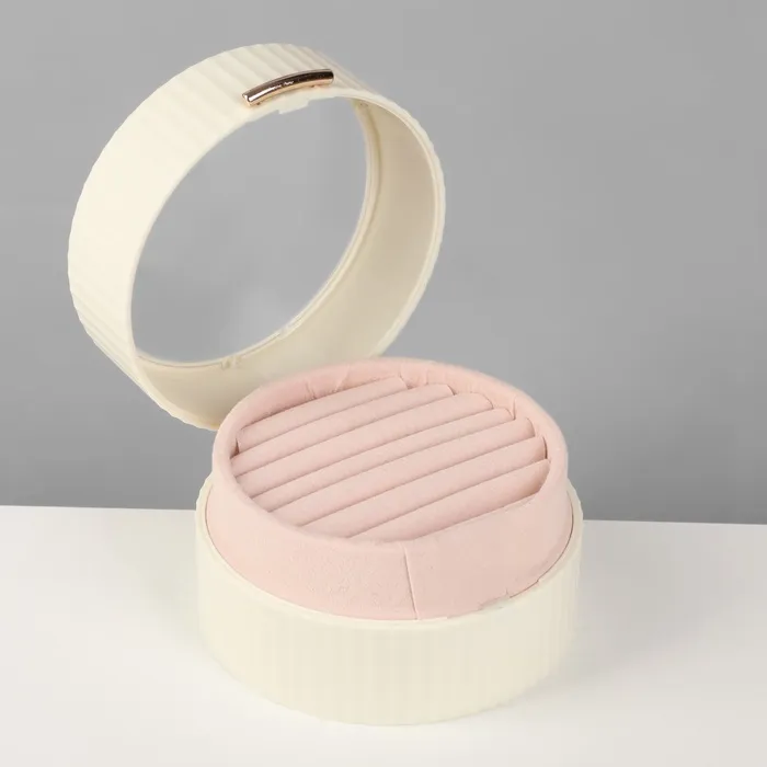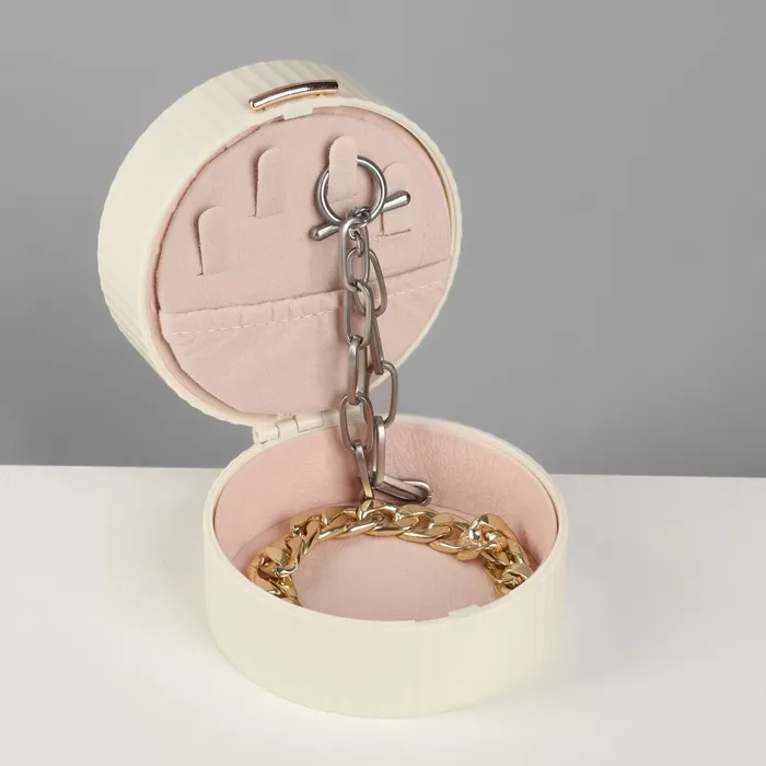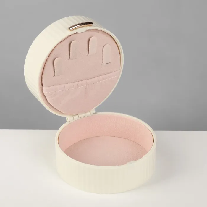 Белая круглая шкатулка с семью аккуратными полосами — это идеальное решение для хранения колец, серёжек и других мелких украшений. Компактные размеры 9×9×5,5 см позволяют разместить её на туалетном столике или в косметическом наборе, не занимая много места, при этом обеспечивая порядок и безопасность ваших любимых аксессуаров.